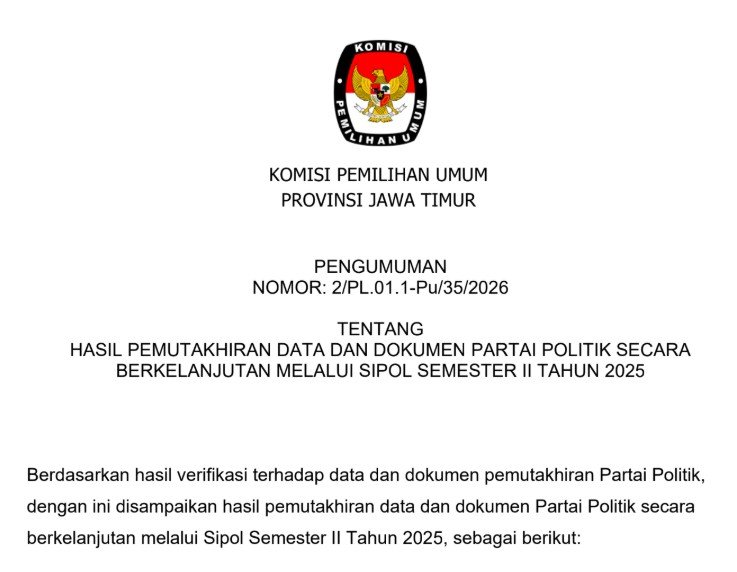 Halo, #TemanPemilih.. KPU Provinsi Jawa Timur telah menyampaikan hasil pemutakhiran data dan dokumen Partai Politik secara berkelanjutan melalui Sistem Informasi Partai Politik (SIPOL) Semester II Tahun 2025. Berikut disampaikan Daftar Partai Politik yang melakukan maupun tidak melakukan pemutakhiran dapat dilihat pada pengumuman resmi (Nomor: 2/PL.01.1-Pu/35/2026) yang diterbitkan di Surabaya, 2 Januari 2026 Klik di Sini ....
