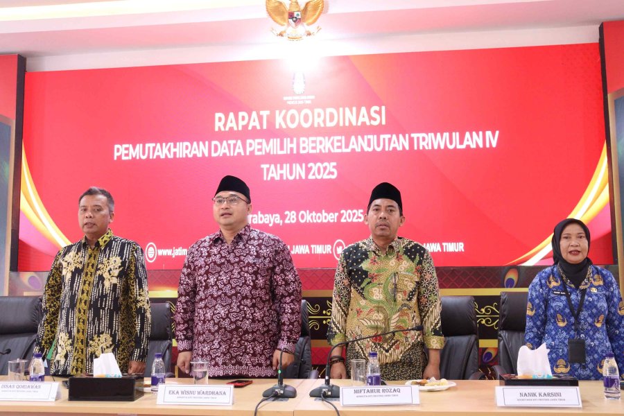 Surabaya, jatim.kpu.go.id- Dalam rangka mewujudkan akurasi data pemilih, Komisi Pemilihan Umum Provinsi Jawa Timur (KPU Jatim) menggelar Rapat Koordinasi (Rakor) Pemutakhiran Data Pemilih Berkelanjutan (PDPB) Triwulan IV Tahun 2025. Rakor dilaksanakan pada Selasa, 28 Oktober 2025 di aula lantai 2 kantor KPU Jatim, Jalan Raya Tenggilis Nomor 1-3 Surabaya.