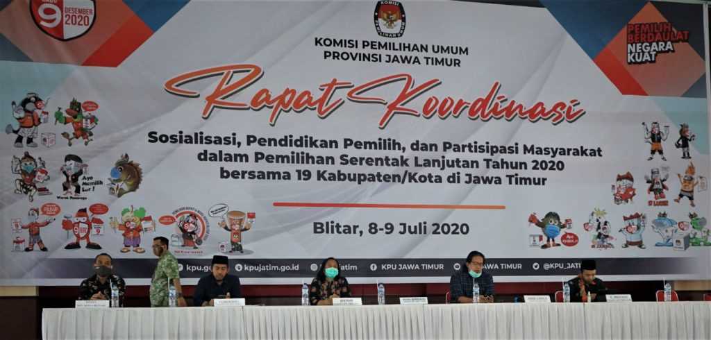 Blitar, jatim.kpu.go.id- Komisi Pemilihan Umum Jawa Timur (KPU Jatim) bersama dengan 19 KPU Kabupaten/ Kota Penyelenggara Pemilihan Serentak Lanjutan Tahun 2020 melakukan koordinasi dan pembahasan terkait metode sosialisasi yang efektif di masa pandemi Covid-19 dua hari ini, Rabu-Kamis (8-9/7). Pembahasan dan koordinasi ini bertempat di Gedung Kesenian Aryo, jalan Kenari Nomor 9 Blitar.