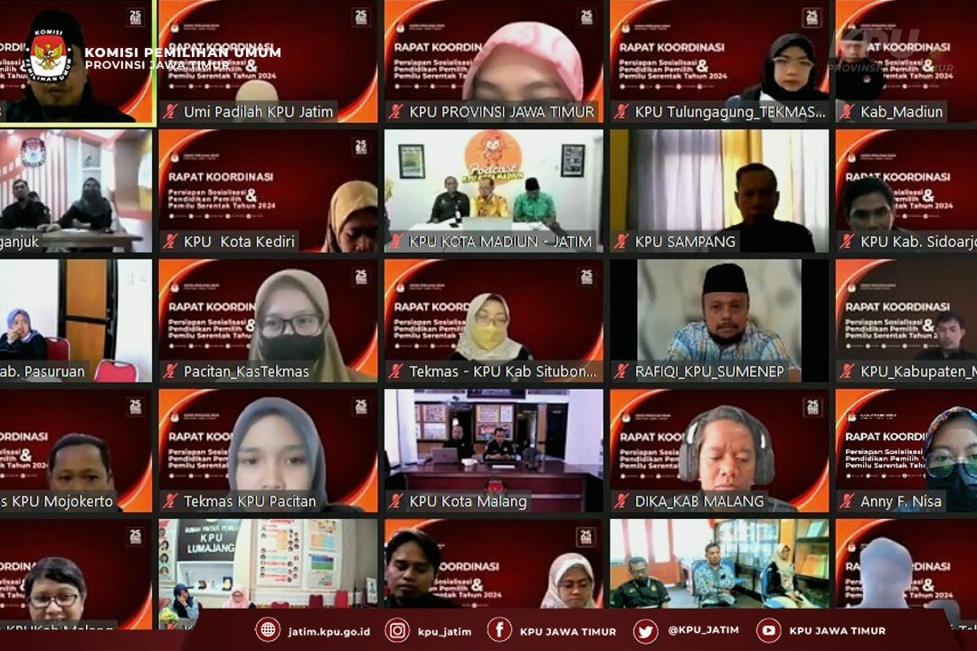 Surabaya, jatim.kpu.go.id- Dalam rangka mengantisipasi adanya bias informasi pada Pemilu Serentak Tahun 2024, Komisi Pemilihan Umum Provinsi Jawa Timur (KPU Jatim) bersama 38 KPU Kabupaten/ Kota di Jawa Timur melakukan rapat koordinasi (rakor) persiapan program Sosialisasi dan Pendidikan Pemilih (Sosdiklih) jelang tahapan yang akan segera dimulai pada 14 Juni 2022 mendatang. Persiapan dilakukan dalam bentuk rakor yang dilaksanakan melalui media dalam jaringan hari ini, Rabu (25/5), mulai jam 10 pagi sampai selesai.