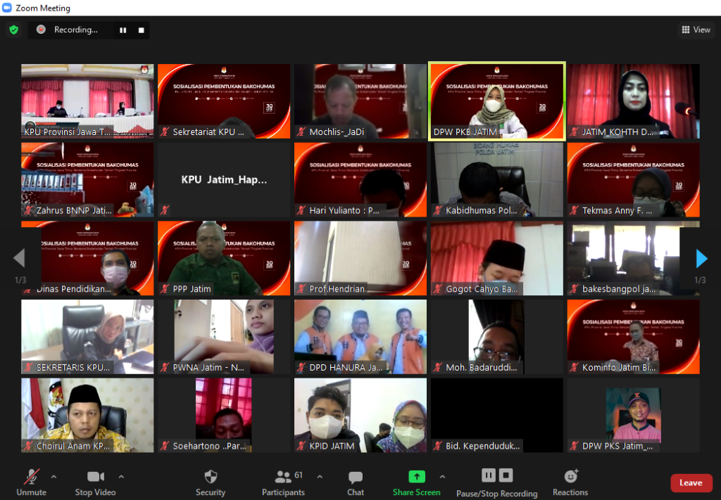 Surabaya, jatim.kpu.go.id- Badan Koordinasi Kehumasan (Bakohumas) Komisi Pemilihan Umum Provinsi Jawa Timur (KPU Jatim) miliki peran yang sangat strategis. Hal ini disampaikan secara kompak oleh semua Keynote Speaker pada kegiatan Sosialisasi Pembentukan Bakohumas KPU Provinsi Jawa Timur bersama Stakeholder Terkait Tingkat Provinsi secara virtual, dimulai dari jam setengah 9 pagi sampai jam 12 siang ini (30/6).