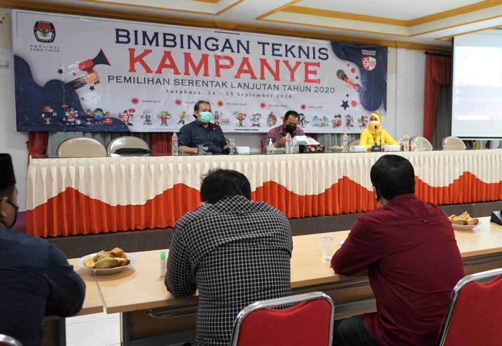 Surabaya, jatim.kpu.go.id- Jelang tahapan kampanye yang dimulai pada tanggal 26 September 2020, Komisi Pemilihan Umum Provinsi Jawa Timur (KPU Jatim) mengadakan Bimbingan Teknis (Bimtek) Kampanye bersama dengan 19 KPU Kabupaten/ Kota. Bimtek dilaksanakan guna untuk menyamakan persepsi atau pemahaman mengenai regulasi yang ada.