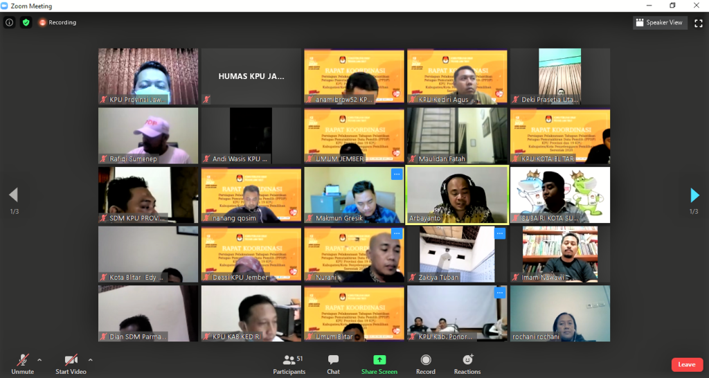Surabaya, jatim.kpu.go.id- Komisi Pemilihan Umum Jawa Timur (KPU Jatim) menggelar rapat koordinasi (rakor) secara daring bersama dengan Divisi Sosdiklih; Parmas dan SDM serta Divisi Hukum dan Penyelenggaraan dari 19 KPU Kabupaten/ Kota. Rakor ini diselenggarakan dalam rangka melakukan koordinasi terkait dengan persiapan pelantikan PPDP (Petugas Pemutakhiran Data Pemilih) yang akan dilaksanakan besok pada tanggal 14 dan 15 Juli 2020.
