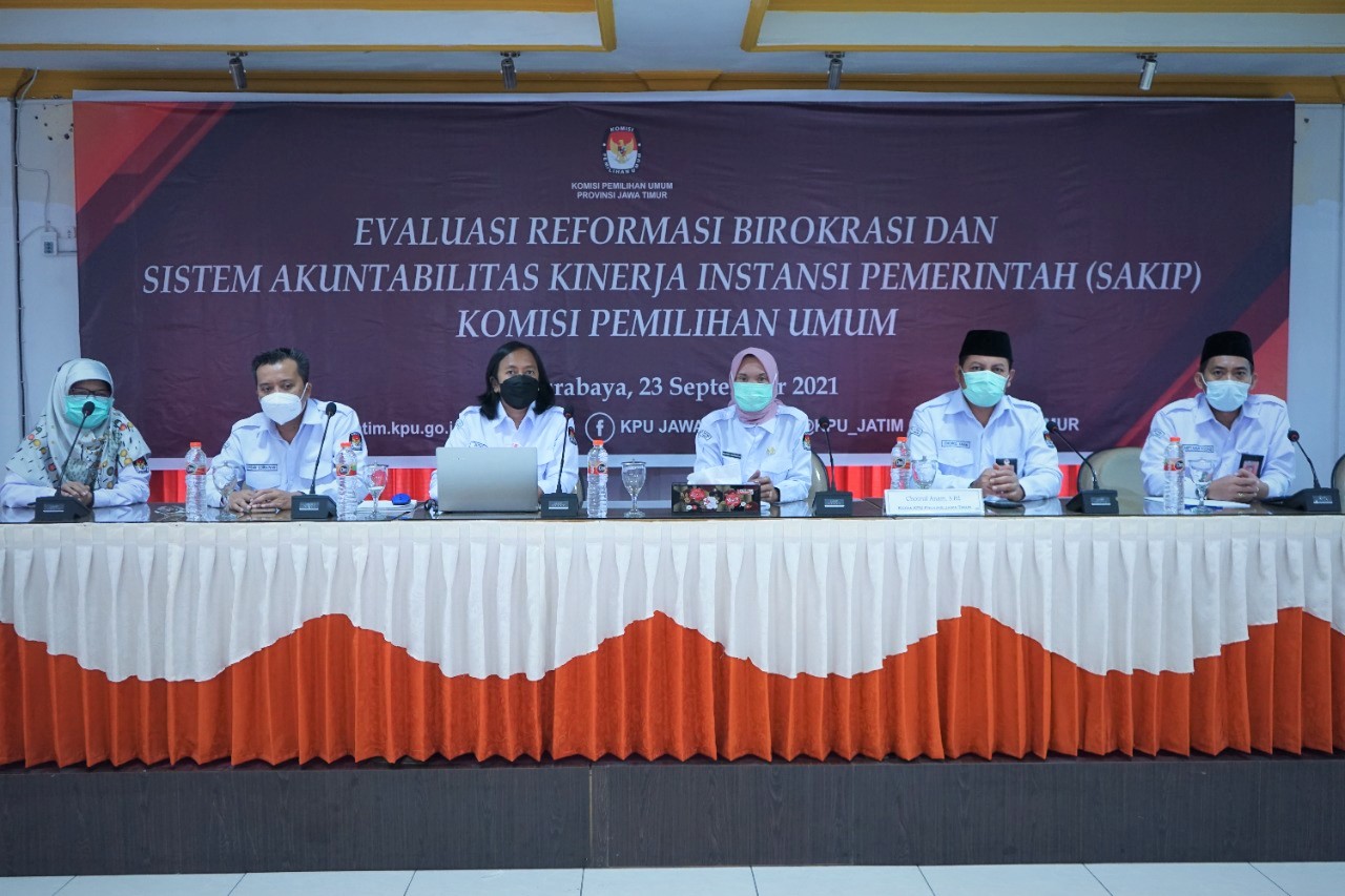Surabaya, jatim.go.id- Terpilih menjadi salah satu unit kerja sampel KPU Provinsi yang menerapkan Reformasi Birokrasi, KPU Provinsi Jawa Timur (KPU Jatim-red) berkesempatan mengikuti Evaluasi Reformasi Birokrasi dan Sistem Akuntabilitas Kinerja Instansi Pemerintah (SAKIP) hari ini, Kamis (23/9). Pelaksanaan Evaluasi Reformasi Birokrasi dan SAKIP oleh Kementerian PAN dan RB berlangsung secara hybrid mulai dari pukul 08.30-16.00 WIB.