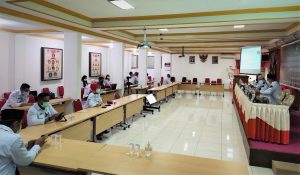 Ketua, Anggota, Sekretaris dan jajaran Sekretariat KPU Jatim mengikuti evaluasi secara daring dari ruang aula lantai 2 kantor KPU Jatim, jalan Raya Tenggilis Nomor 1-3 Surabaya.