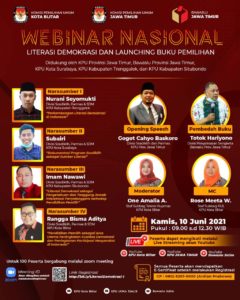 Webinar Nasional “Literasi dan Launching Buku Pemilihan” ini berlangsung dari pukul 09.00 – 13.00 WIB. Menghadirkan empat narasumber ahli yakni, Divisi Sosdiklih dan Parmas KPU Kabupaten Trenggalek, Nurani Soyomukti, Divisi Sosdiklih dan Parmas KPU Kota Surabaya, Subairi, Divisi Sosdiklih dan Parmas KPU Kabupaten Situbondo, Imam Nawawi, serta Divisi Sosdiklih dan Parmas KPU Kota Blitar, Rangga Bisma.