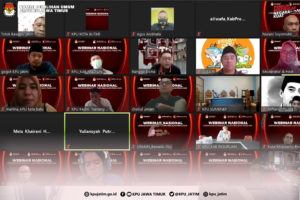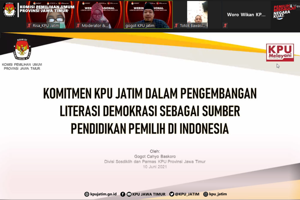 Surabaya, jatim.kpu.go.id- Keberhasilan pelaksanaan Pemilihan Serentak Tahun 2020 di Jawa Timur penting untuk didokumentasikan. Demikian penggalan pernyataan Divisi Sosdiklih dan Parmas Komisi Pemilihan Umum Provinsi Jawa Timur, Gogot Cahyo Baskoro pada Webinar Nasional “Literasi dan Launching Buku Pemilihan” hari ini (Kamis, 10/6) secara virtual melalui zoom dan kanal youtube.