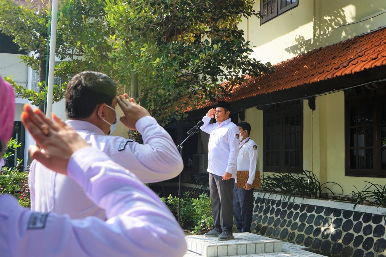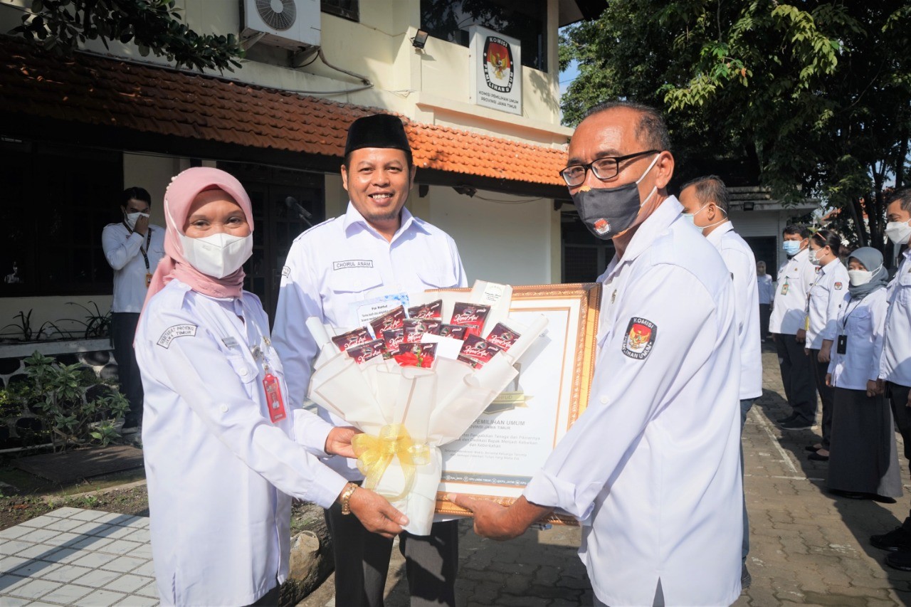 Pada kesempatan ini, Ketua KPU Jatim juga menyampaikan salam perpisahan pada staf sekretariat KPU Jatim, Mahfud yang mulai hari ini purna tugas.