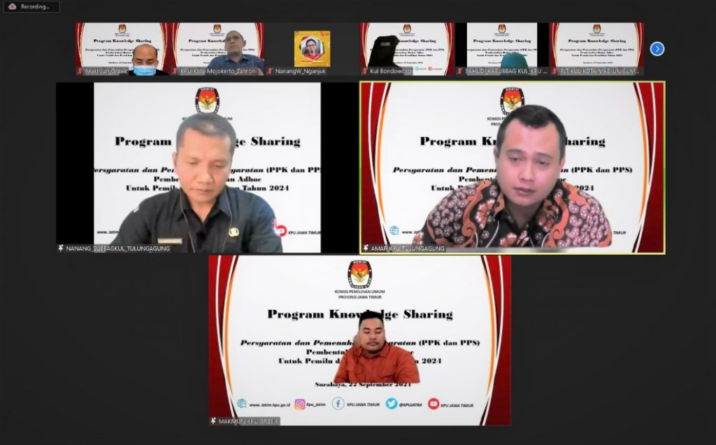 Surabaya, jatim.kpu.go.id- Komisi Pemilihan Umum Provinsi JawaTimur (KPU Jatim) bersama dengan 38 KPU Kabupaten/ Kota di Jawa Timur mengadakan Knowledge Sharing Edisi 5 secara daring (Rabu, 22/9). Tema yang dibahas pada edisi 5 ini yakni Persyaratan dan Pemenuhan Syarat Anggota PPK dan PPS untuk Pemilu dan Pemilihan Tahun 2024.
