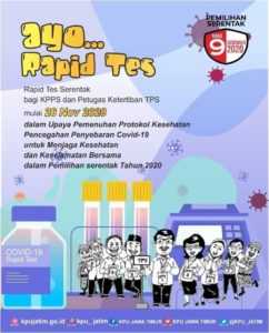 “Pemeriksaan tersebut dilakukan dengan cara rapid test atau swab test/Real Time Polymerase Chain Reaction (RT-PCR). Apabila pemeriksaan dilakukan dengan rapid test, dan hasil pemeriksaan menyatakan reaktif, maka terhadap anggota KPPS yang bersangkutan dapat dilakukan pemeriksaan swab test/Real Time Polymerase Chain Reaction (RT-PCR),” terangnya.