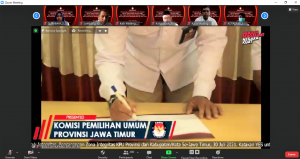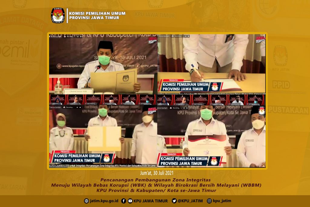 Surabaya, jatim.kpu.go.id- Memasuki babak baru pembangunan zona integritas menuju Wilayah Bebas Korupsi (WBK) dan Wilayah Birokrasi Bersih Melayani (WBBM) di wilayah KPU Provinsi dan KPU Kabupaten/ Kota se-Jawa Timur, KPU Jatim bersama dengan 38 KPU Kabupaten/ Kota melakukan Deklarasi Pembangunan Zona Integritas (Jum’at, 30/7). Deklarasi ini dimulai dari pukul 10.00-11.30 WIB yang digelar secara virtual.