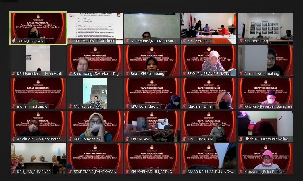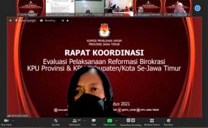 Surabaya, jatim.kpu.go.id- Komisi Pemilihan Umum Provinsi Jawa Timur (KPU Jatim) melakukan evaluasi pelaksanaan reformasi birokrasi di wilayahnya secara virtual hari ini, Jum’at (27/8), pukul 13.00-17.30 WIB. Kegiatan evaluasi ini selanjutnya dikemas dalam Rapat Koordinasi (Rakor) Evaluasi Pelaksanaan Reformasi Birokrasi KPU Provinsi dan KPU Kabupaten/ Kota se-Jawa Timur.