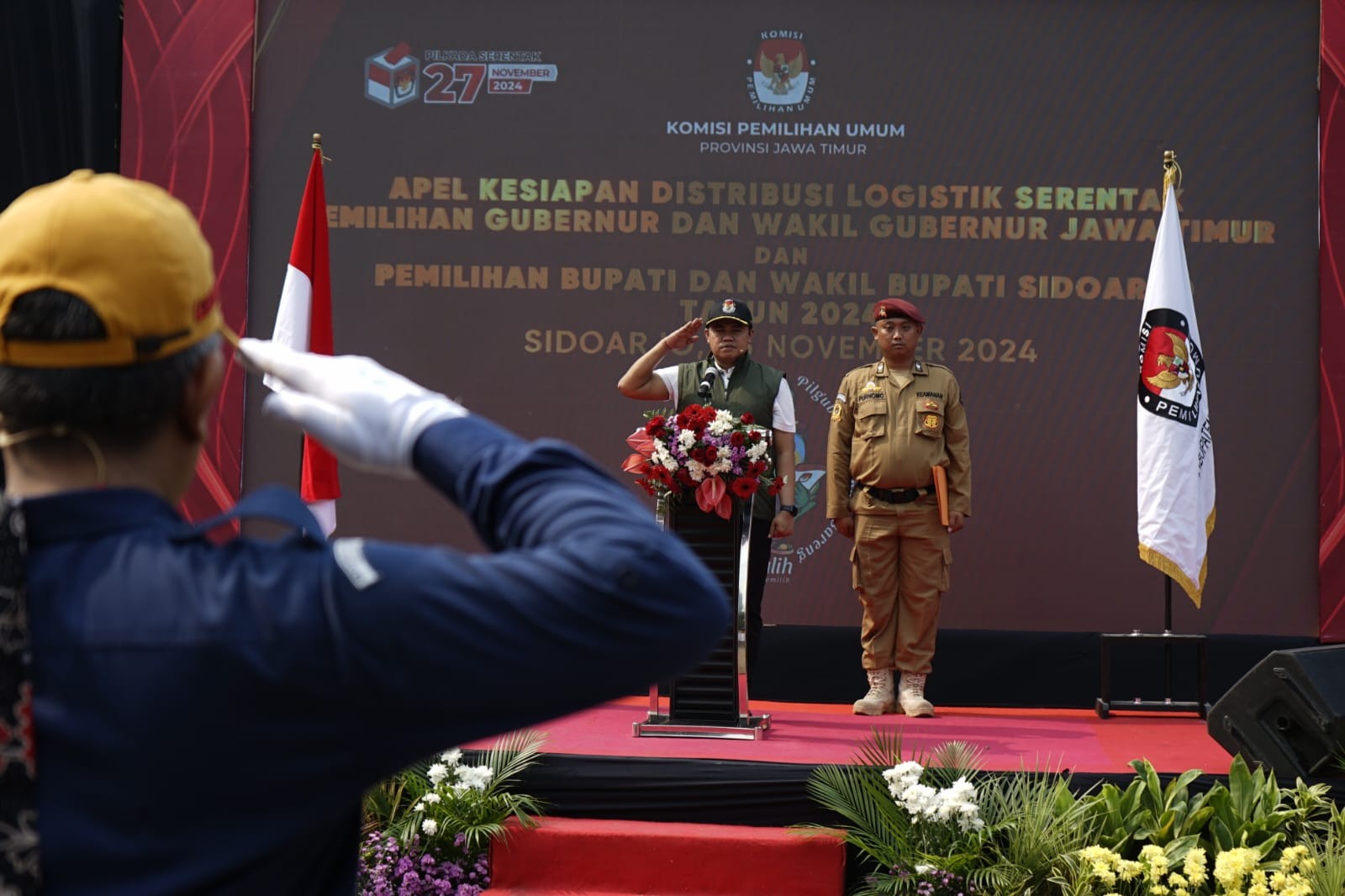 Sidoarjo, kpu.go.id - Komisi Pemilihan Umum Provinsi Jawa Timur (KPU Jatim) menggelar Apel Kesiapan Distribusi Logistik Serentak untuk Pemilihan Gubernur dan Wakil Gubernur, Bupati dan Wakil Bupati, serta Walikota dan Wakil Walikota Tahun 2024 se-Jawa Timur. Apel dilangsungkan di area gudang logistik KPU Sidoarjo, Jalan Erlangga, Kelurahan Celep, Kecamatan Sidoarjo, Kabupaten Sidoarjo, Sabtu, 23 November 2024.