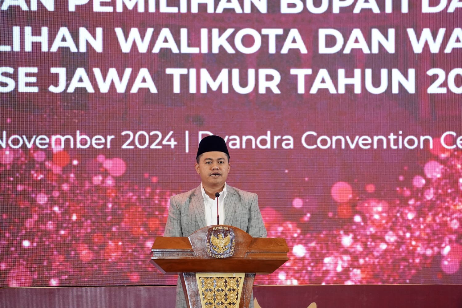 Surabaya, jatim.kpu.go.id - Komisi Pemilihan Umum Provinsi Jawa Timur menggelar Doa Bersama dalam Rangka Kesuksesan Pemilihan Gubernur dan Wakil Gubernur, Bupati dan Wakil Bupati, serta Walikota dan Wakil Walikota se-Jawa Timur Tahun 2024. Doa bersama dilangsungkan di Dyandra Convention Center, Jalan Basuki Rahmat nomor 93-105, Embong Kaliasin, Kecamatan Genteng, Surabaya, Sabtu, 23 November 2024.