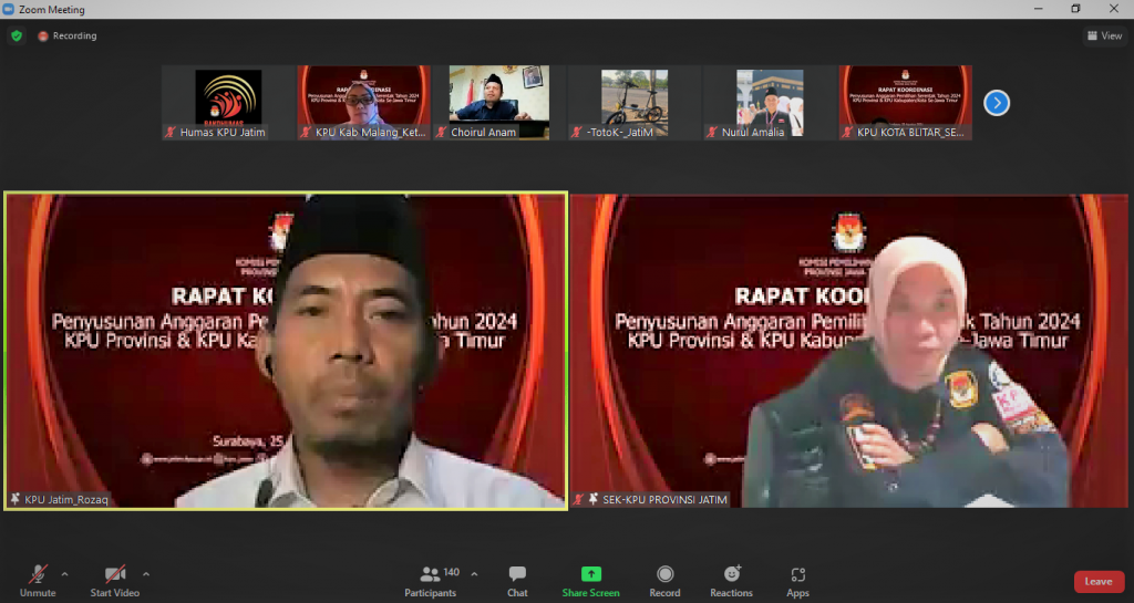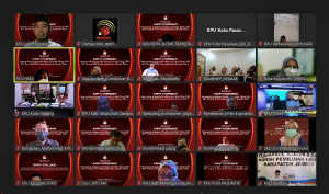 Surabaya, jatim.kpu.go.id- Guna mempersiapkan perencanaan penyusunan anggaran Pemilihan Serentak Tahun 2024, Komisi Pemilihan Umum Provinsi Jawa Timur (KPU Jatim) bersama dengan 38 KPU Kabupaten/ Kota di wilayahnya melakukan Rapat Koordinasi (Rakor) Penyusunan Anggaran Pemilihan Serentak Tahun 2024 hari ini (Rabu, 25/8). Rakor dimulai dari pukul 09.00 – 12.30 WIB secara virtual.