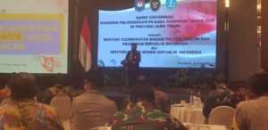Surabaya, jatim.kpu.go.id- Ketua Komisi Pemilihan Umum Provinsi Jawa Timur (KPU Jatim), Choirul Anam menegaskan KPU Jatim siap menyukseskan penyelenggaraan Pemilihan Serentak Lanjutan Tahun 2020. Hal ini disampaikan dalam forum Rapat Koordinasi Kesiapan Pelaksanaan Pilkada Serentak Tahun 2020 di Provinsi Jawa Timur yang dihadiri Menkopolhukam, Mahfud MD dan Mendagri Tito Karnavian di hotel JW Marriot Surabaya (Jum’at, 26/6).