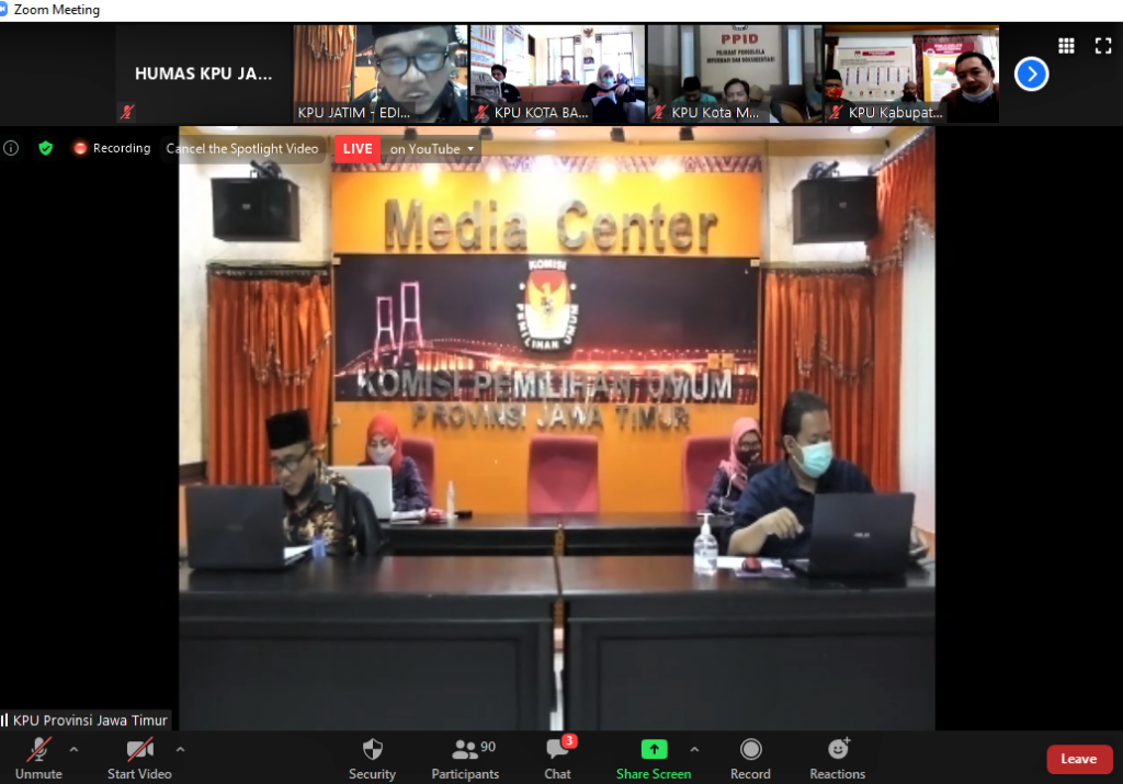 Surabaya, jatim.kpu.go.id- Dalam rangka disiplin penerapan protokol kesehatan (prokes) pada Pemilihan Serentak Lanjutan Tahun 2020, Komisi Pemilihan Umum Provinsi Jawa Timur (KPU Jatim) menggelar Sosialisasi Penerapan Protokol Kesehatan Pencegahan dan Pengendalian Corona Virus Disease 19 (Covid-19) pada Tahapan Pemilihan Serentak Tahun 2020 dengan melibatkan berbagai unsur hari ini (Jum’at, 18/9), pukul 09.30 sampai 11.30 WIB secara daring melalui aplikasi zoom serta live streaming chanel youtube KPU Jatim (KPU JAWA TIMUR).
