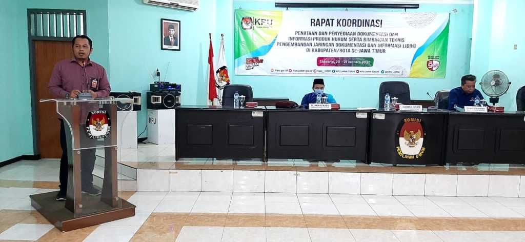 Sidoarjo, jatim.kpu.go.id- Komisi Pemilihan Umum (KPU) saat ini mengembangkan Jaringan Dokumentasi dan Informasi Hukum (JDIH) sampai dengan tingkatan Kabupaten/ Kota. Demikian disampaikan Kabag Hukum; Teknis dan Hupmas KPU Jatim, Yulyani Dewi pada Rakor Penataan dan Penyediaan Dokumentasi dan Informasi Produk Hukum serta Bimtek Pengembangan JDIH pada Kabupaten/ Kota se-Jawa Timur.