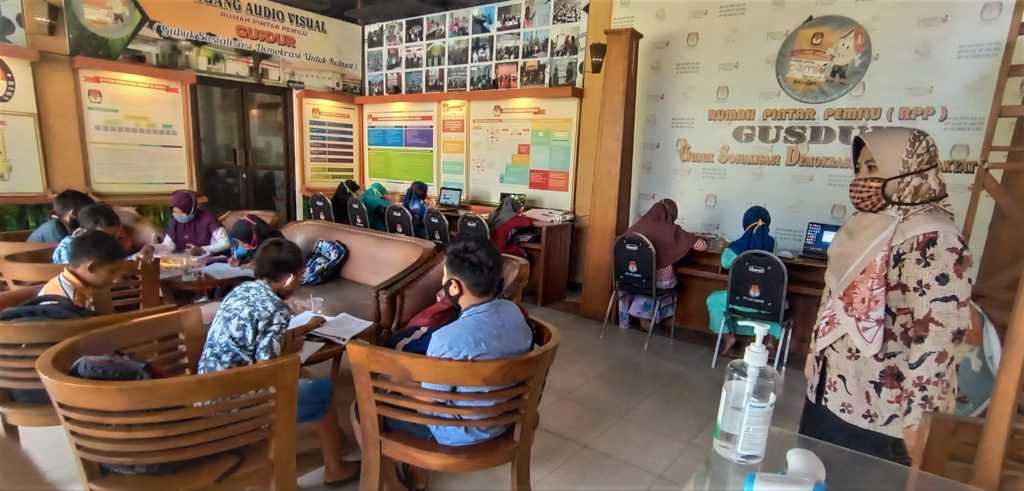 Jombang, jatim.kpu.go.id- Siswa-siswi sekolah berduyun-duyun datangi RPP (Rumah Pintar Pemilu) KPU Kabupaten Jombang, Selasa (18/8). Ada yang berboncengan dengan sepeda onthel, ada juga yang jalan kaki. Kedatangan para siswa ini dalam rangka memanfaatkan layanan fasilitas wifi gratis yang disediakan KPU Kabupaten Jombang untuk pembelajaran daring.