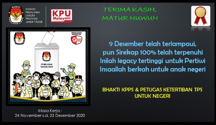 “Terima kasih telah bergabung sebagai keluarga penyelenggara pemilihan tahun 2020. Pengabdian dalam menjalankan tugas pemungutan dan penghitungan suara ditengah pandemi Covid-19 bukanlan sesuatu yang yang mudah, namun dapat dilaksanakan dengan baik. Bhakti KPPS dan Petugas Ketertiban TPS untuk demokrasi yang sehat dan berintegritas semoga dicatat sebagai amal baik dan dilipatgandakan pahalanya,” pungkasnya.