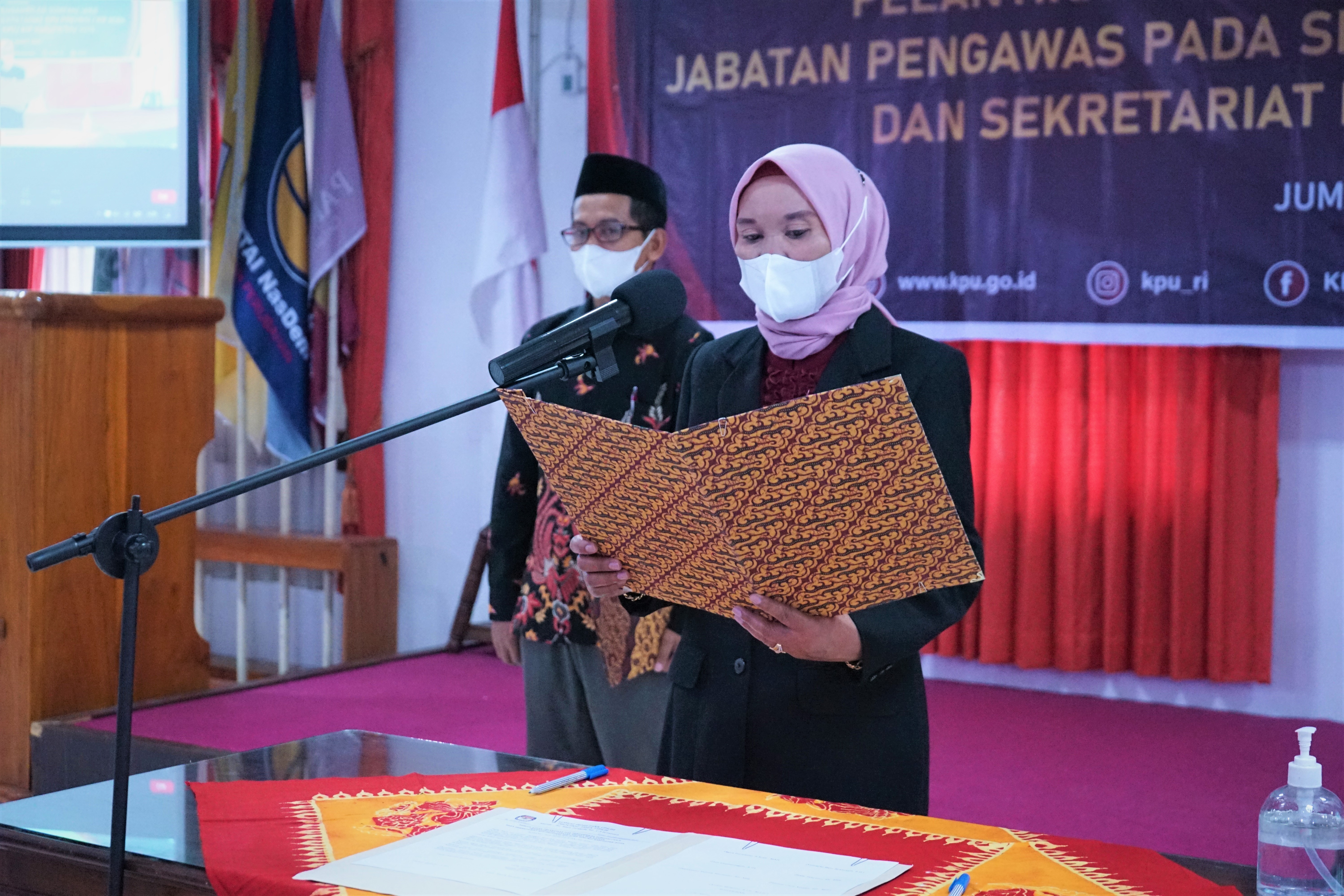 Pada kesempatan ini, Nanik membacakan naskah sambutan Sekjen KPU, Bernad Dermawan Sutrisno. Di dalam sambutan tersebut Nanik menyampaikan bahwa Pelantikan dan Pengambilan Sumpah/ Janji pada hari ini merupakan bagian dari pelaksanaan Peraturan KPU Nomor 14 Tahun 2020 secara tuntas.