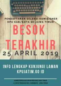 Surabaya, jatim.kpu.go.id- Pendaftaran Calon Anggota Komisi Pemilihan Umum (KPU) di 36 Kabupaten/ Kota di Jawa Timur, selain Kabupaten Tulungagung dan Kabupaten Probolinggo (sudah melakukan rekrutmen sebelumnya-red) tinggal satu hari lagi. Yakni, besok hari Kamis, tanggal 25 April 2019.