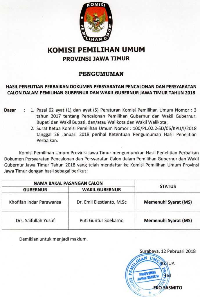 Pengumuman Hasil Penelitian Perbaikan Dokumen Persyaratan Pencalonan dan Persyaratan Calon dalam Pemilihan Gubernur dan Wakil Gubernur (Pilgub) Jawa Timur Tahun 2018: