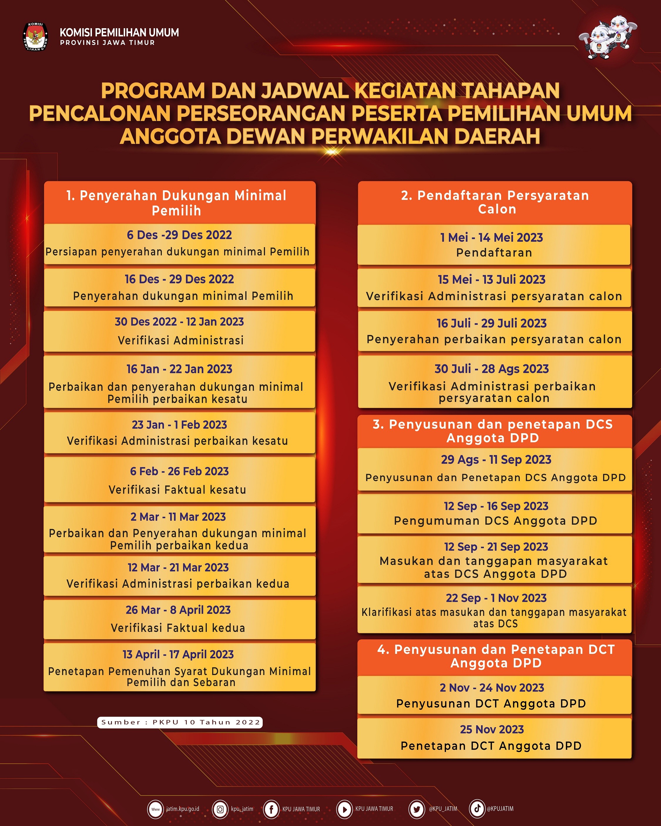 Pengumuman Nomor : 2714/PL.01.4-PU/35/2022 tentang Persiapan Penyerahan Dukungan Minimal Bakal Calon Anggota Dewan Perwakilan Daerah (DPD). Selengkapnya #TemanPemilih dapat mengakses pada link berikut Unduh di Sini