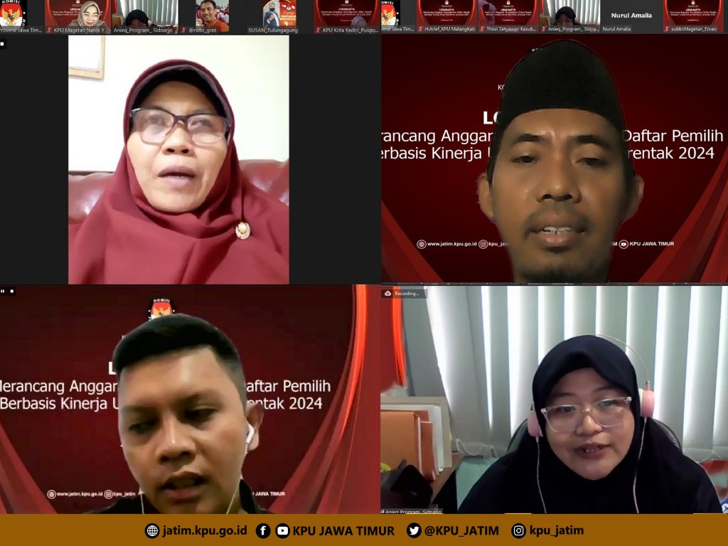 Surabaya, jatim.kpu.go.id- Dalam rangka mempersiapkan perencanaan Pemilu Tahun 2024, Komisi Pemilihan Umum Provinsi Jawa Timur (KPU Jatim) menggelar Lokakarya Merancang Anggaran Pemutakhiran Daftar Pemilih Berbasis Kinerja Untuk Pemilihan Serentak 2024 KPU Provinsi dan KPU Kabupaten/ Kota Se-Jawa Timur (24/9). Lokakarya digelar secara daring mulai pukul 13.00-16.30 WIB, dengan melibatkan Ketua, Divisi Perencanaan; Data dan Informasi (Rendatin), serta Kasubbag/ Subkoordinator Program dan Data (Progda) dari 38 KPU Kabupaten/ Kota se-Jawa Timur.