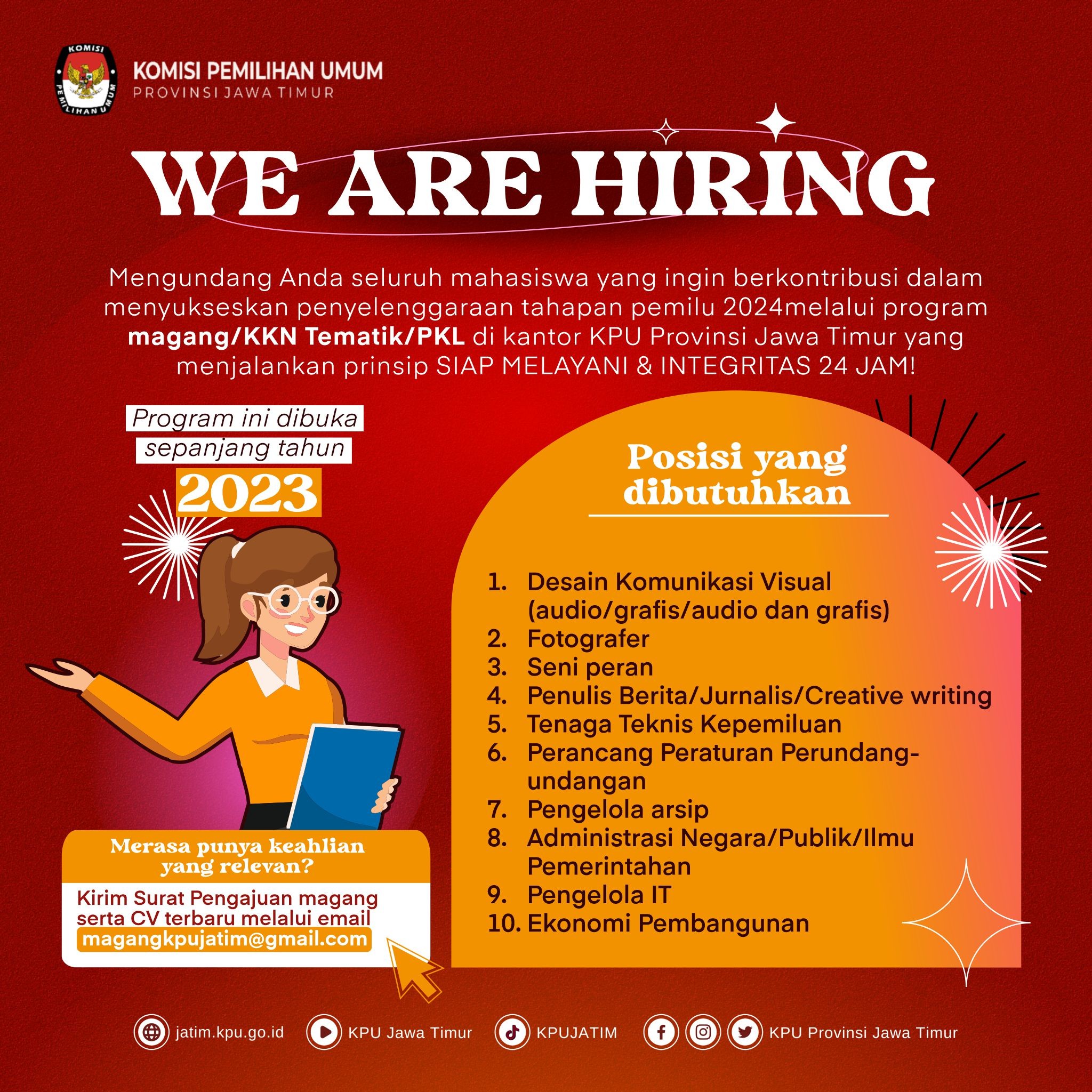 Mengundang Anda seluruh mahasiswa yang ingin berkontribusi dalam menyukseskan penyelenggaraan tahapan Pemilu 2024 melalui program magang/KKN Tematik/PKL di kantor KPU Provinsi Jawa Timur yang menjalankan prinsip SIAP MELAYANI dan INTEGRITAS 24 JAM