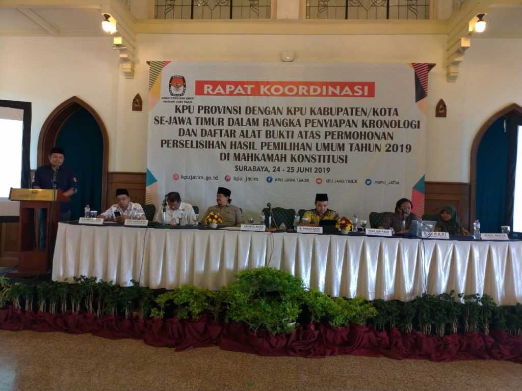 Surabaya, jatim.kpu.go.id- Siapkan kronologi dan alat bukti untuk sidang gugatan sengketa perselisihan hasil pemilihan umum (PHPU) DPR RI, Komisi Pemilihan Umum Jawa Timur (KPU Jatim) bersama dengan 38 KPU Kabupaten/ Kota di wilayahnya menggelar rapat koordinasi Bersama. Rakor dilaksanakan selama 2 hari, Senin-Selasa, tanggal 24 sampai dengan 25 Juni 2019 di hotel Majapahit jalan Tungjungan Nomor 65-71 Surabaya.