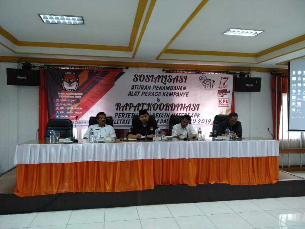 Adapun materi rakor membahas aturan penambahan Alat Peraga Kampanye (APK) dan persetujuan desain materi (approval) APK Fasilitasi KPU Provinsi Jawa Timur dalam Pemilu 2019. Rakor dipimpin langsung oleh Divisi Sumber Daya Manusia dan Partisipasi Masyarakat (SDM dan Parmas) KPU Jatim, Gogot Cahyo Baskoro.