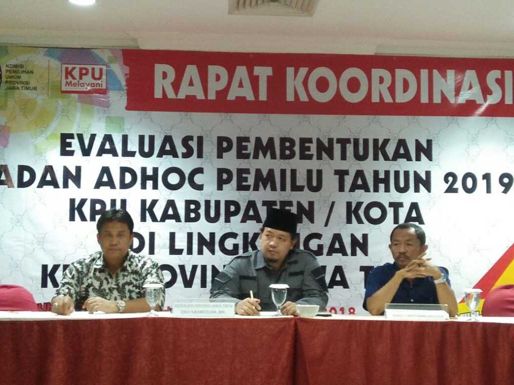 Sidoarjo, jatim.kpu.go.id- Komisi Pemilihan Umum Jawa Timur (KPU Jatim) gelar rapat koordinasi (rakor) di Sun City Hotel Sidoarjo (Rabu, 25/4). Rakor diadakan dalam rangka evaluasi pembentukan badan adhoc pemilu tahun 2019 di lingkungan KPU Provinsi dan Kabupaten/ Kota. Pada kesempatan ini, KPU Jatim sekaligus memberikan masukan untuk pembentukan badan adhoc.