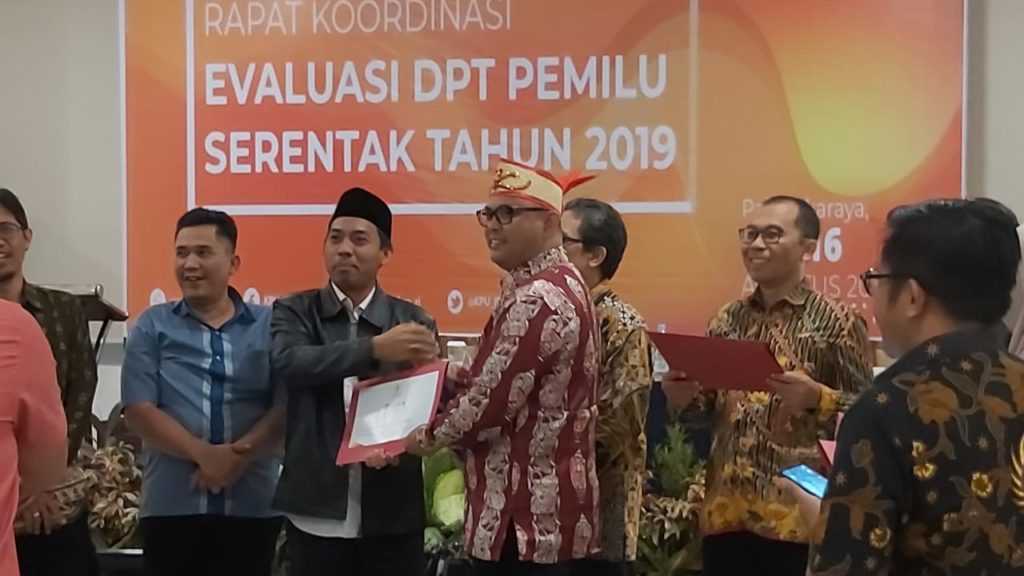 Palangkaraya, jatim.kpu.go.id- Komisi Pemilihan Umum Jawa Timur (KPU Jatim) menerima penghargaan sebagai provinsi terbaik ketiga dengan presentase DPK (Daftar Pemilih Khusus) terhadap DPT (Daftar Pemilih Tetap) terbaik dalam proses penyusunan daftar pemilih pemilu 2019. Penghargaan disampaikan KPU RI pada rapat koordinasi (rakor) Evaluasi DPT Pemilu Serentak Tahun 2019 (15/8).