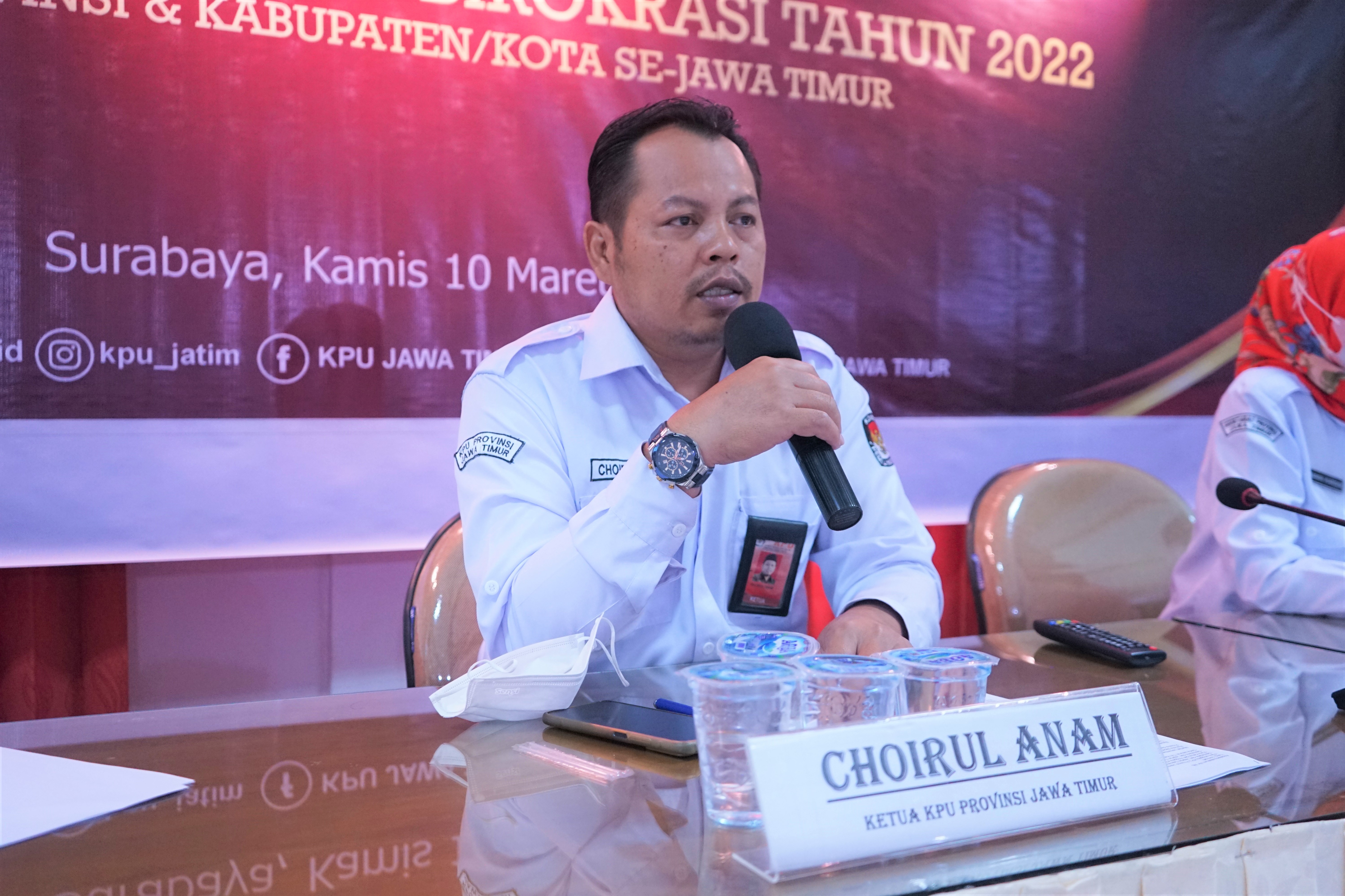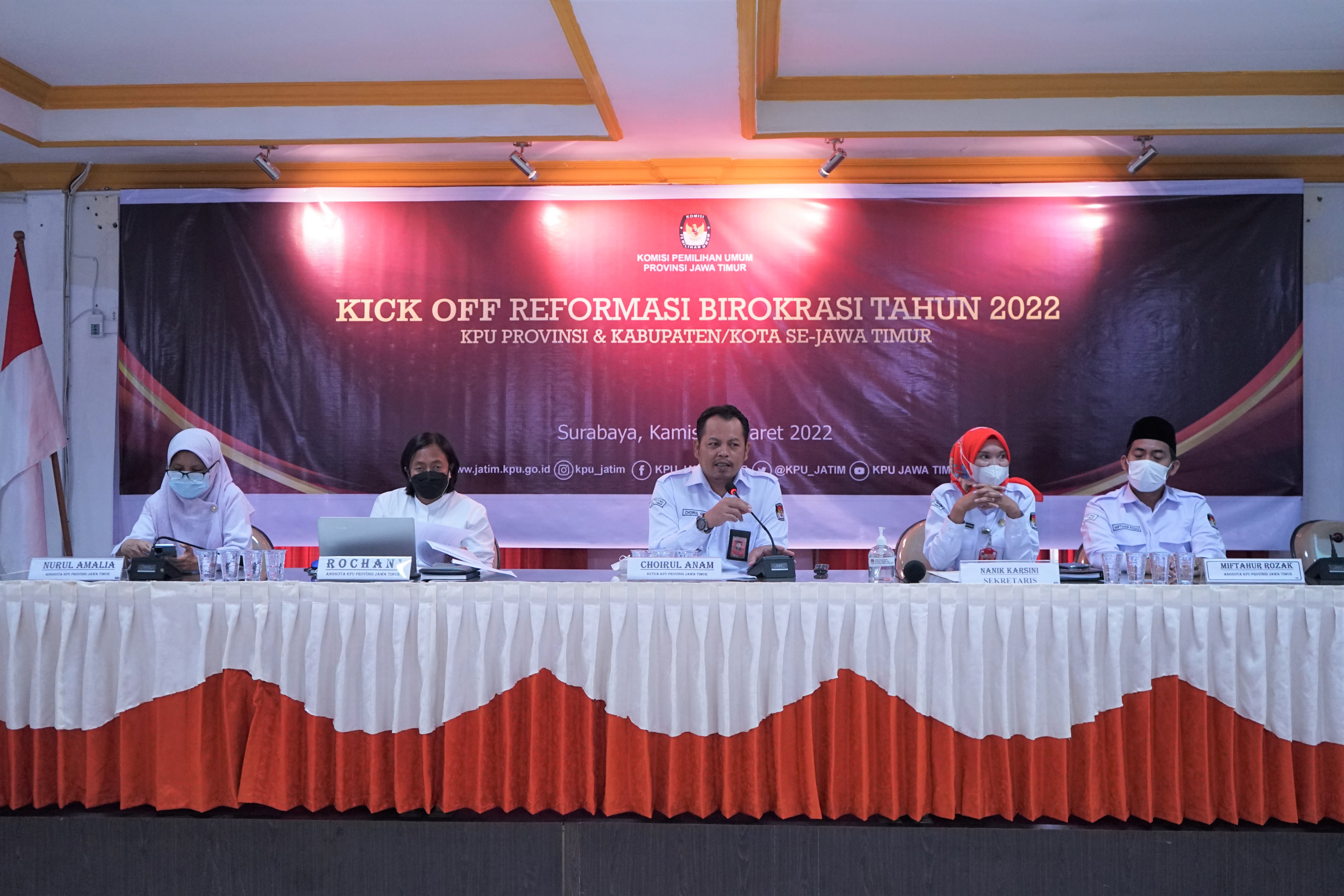 Demikian disampaikan Ketua KPU Jatim, Choirul Anam saat memberikan sambutan pada Kick Off Reformasi Birokrasi Tahun 2022 yang dilaksanakan oleh KPU Provinsi Jawa Timur (KPU Jatim) bersama dengan 38 KPU Kabupaten/ Kota pada Kamis (10/3) secara hybrid.