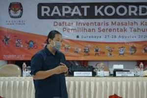 Surabaya, jatim.kpu.go.id- Selepas menggelar FGD (Forum Group Discussion) Pembahasan Konsep Materi Pendidikan Pemilih, Komisi Pemilihan Umum Provinsi Jawa Timur (KPU Jatim) melaksanakan Rapat Koordinasi Penyusunan Daftar Inventarisir Masalah (DIM) Pelaksanaan Kampanye Pemilihan Serentak Lanjutan Tahun 2020 pada Jumat (28/8) di aula Kantor KPU Jatim, jalan Raya Tenggilis nomor 1-3 Surabaya.