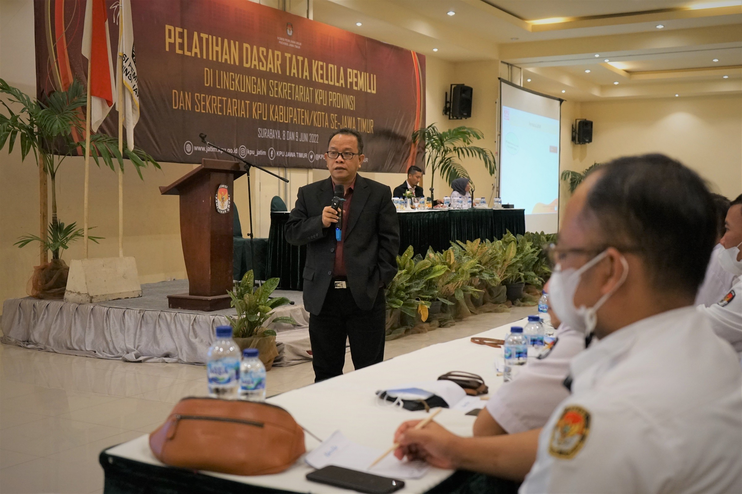 Surabaya, jatim.kpu.go.id- Sekretaris Jenderal (Sekjen) KPU Republik Indonesia, Bernad Dermawan Sutrisno menekankan bahwa Pegawai Negeri Sipil (PNS) di lingkungan sekretariat jenderal KPU harus menjadi sumber daya manusia yang berkompeten, berintegritas, dan berwibawa. Demikian disampaikan dalam arahannya pada pembukaan Pelatihan Dasar Tata Kelola Pemilu Bagi PNS di lingkungan Sekretariat KPU Provinsi dan Kabupaten/ Kota se-Jawa Timur tahap 2 hari ini, Kamis (9/6).