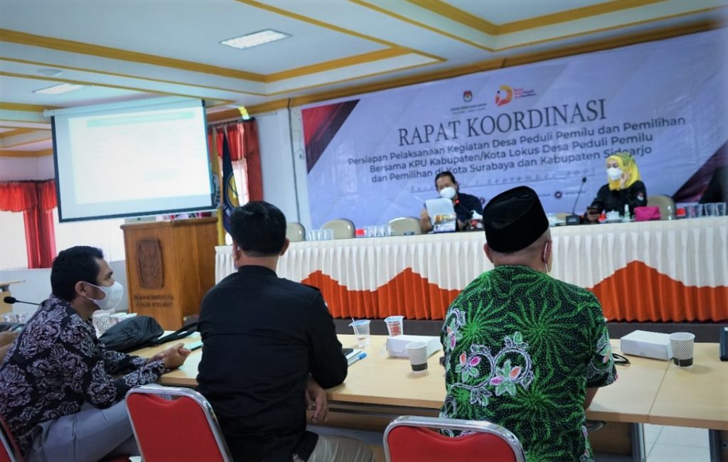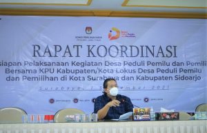 Surabaya, jatim.kpu.go.id- Persiapkan pelaksanaan Desa Peduli Pemilu & Pemilihan (DP3), Komisi Pemilihan Umum Provinsi Jawa Timur (KPU Jatim) melakukan koordinasi dengan dua KPU Kabupaten/ Kota lokus DP3 Rabu (1/9), jam 10 pagi di aula lantai II kantor KPU Jatim, jalan Raya Tenggilis Nomor 1-3 Surabaya. Dua KPU Kabupaten/ Kota lokus DP3 yakni, KPU Kabupaten Sidoarjo dan KPU Kota Surabaya.