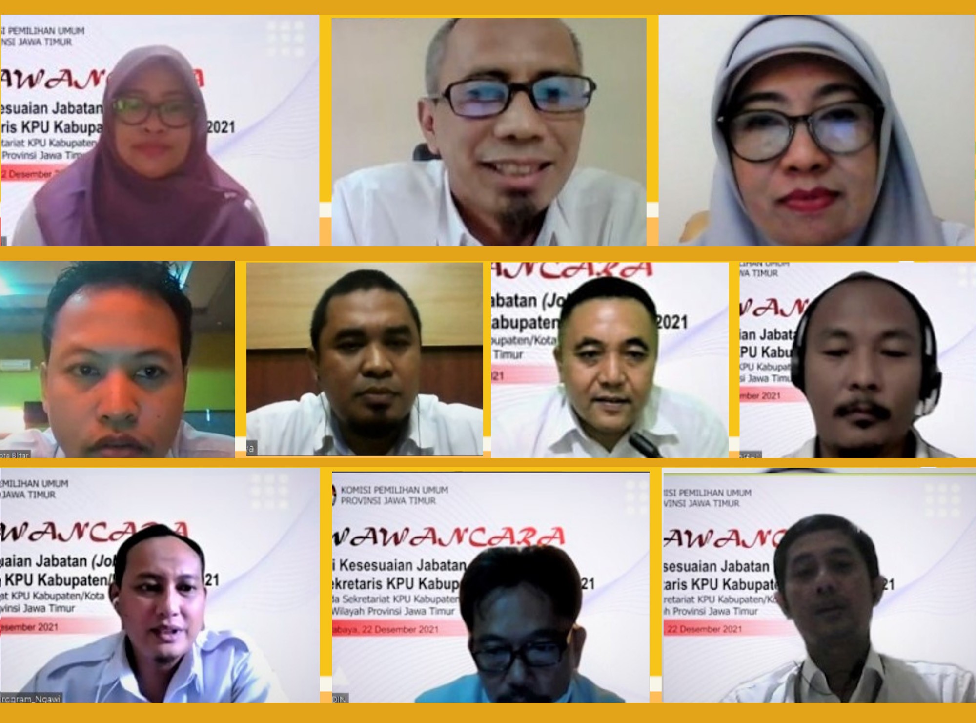 Surabaya, jatim.kpu.go.id- Tim Uji Kesesuaian Jabatan (Job Fit) Sekretaris pada Sekretariat KPU Kabupaten/ Kota di Wilayah Provinsi Jawa Timur telah melaksanakan wawancara untuk peserta yang mendaftar di KPU Kabupaten Blitar, Kabupaten Ngawi serta Kota Blitar hari ini, Rabu (22/12). Wawancara dilaksanakan secara daring dan berlangsung dari sekitar pukul 11.00 sampai 17.00 WIB.