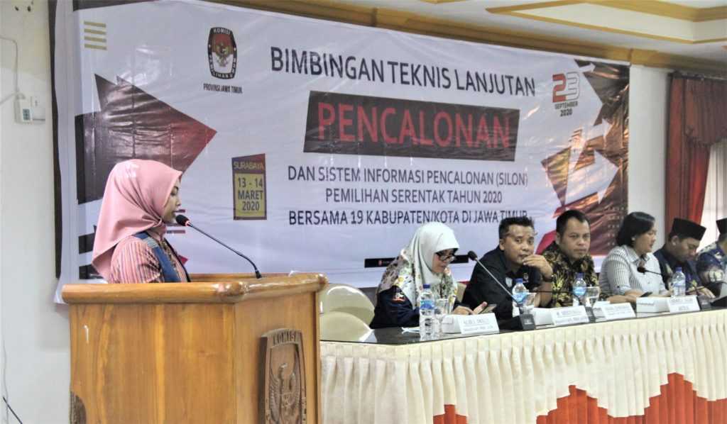 Surabaya, jatim.kpu.go.id- Menindaklanjuti adanya Peraturan KPU Nomor 1 Tahun 2020 terkait Pencalonan, Komisi Pemilihan Umum Jawa Timur (KPU Jatim) melaksanakan Bimbinan Teknis Lanjutan Pencalonan dan Sistem Informasi Pecalonan (SILON) Pemilihan Serentak Tahun 2020 bersama dengan 19 KPU Kabupaten/ Kota di Jawa Timur. Bimtek dilaksanakan selama dua (2) hari, Jum’at sampai Sabtu, 13-14 Maret 2020 dan bertempat di aula lantai II kantor KPU Jatim, jalan Raya Tenggilis Nomor 1-3 Surabaya.