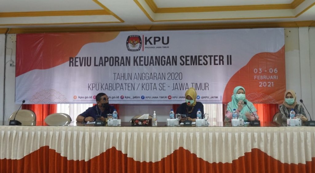 Penyusunan laporan keuangan serta reviu laporan keuangan Semester II Tahun Anggaran 2020 (Unaudited) melibatkan Sekretaris/ KPA, Pejabat Pembuat Komitmen (PPKom), Bendahara APBN, Bendahara Hibah, operator Sistem Akuntansi Instansi Berbasis Akrual (SAIBA) dan operator Sistem Informasi Manajemen dan Akuntansi Barang Milik Negara (SIMAK-BMN) KPU Jatim dan 38 KPU Kabupaten/ Kota di Jawa Timur.