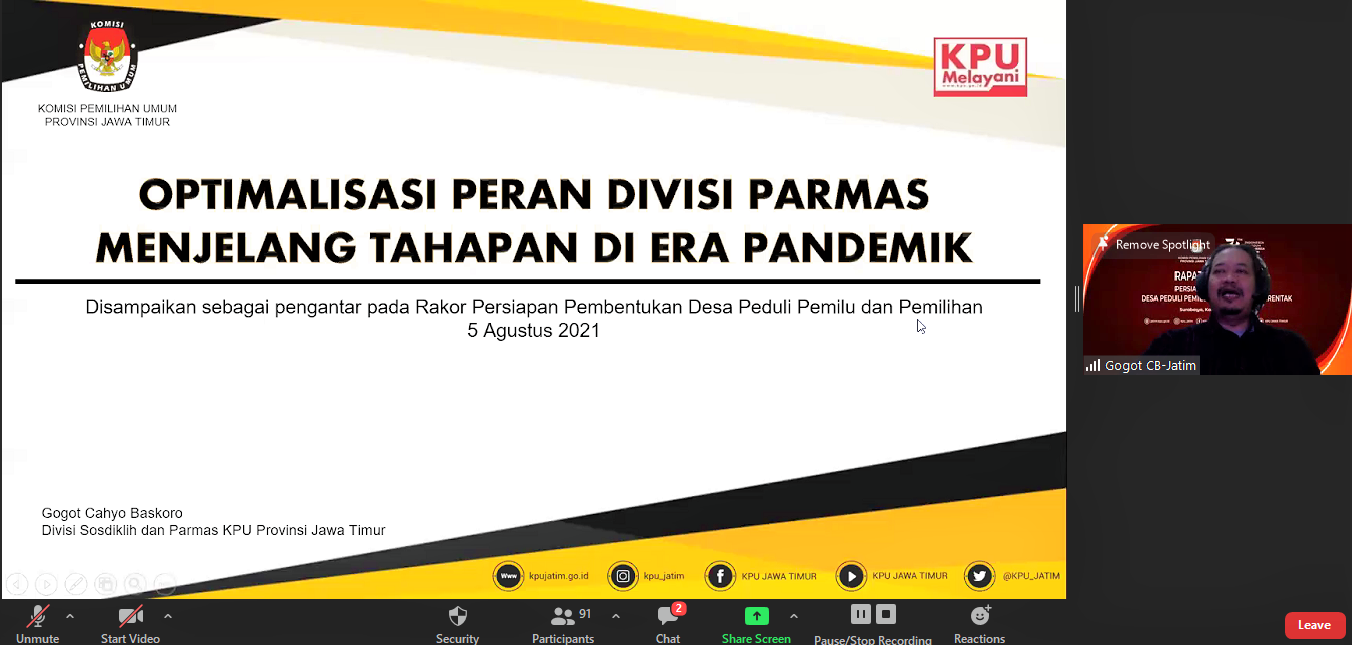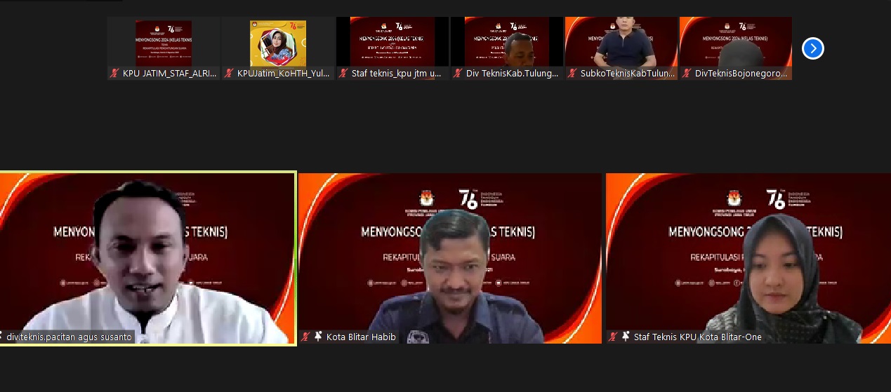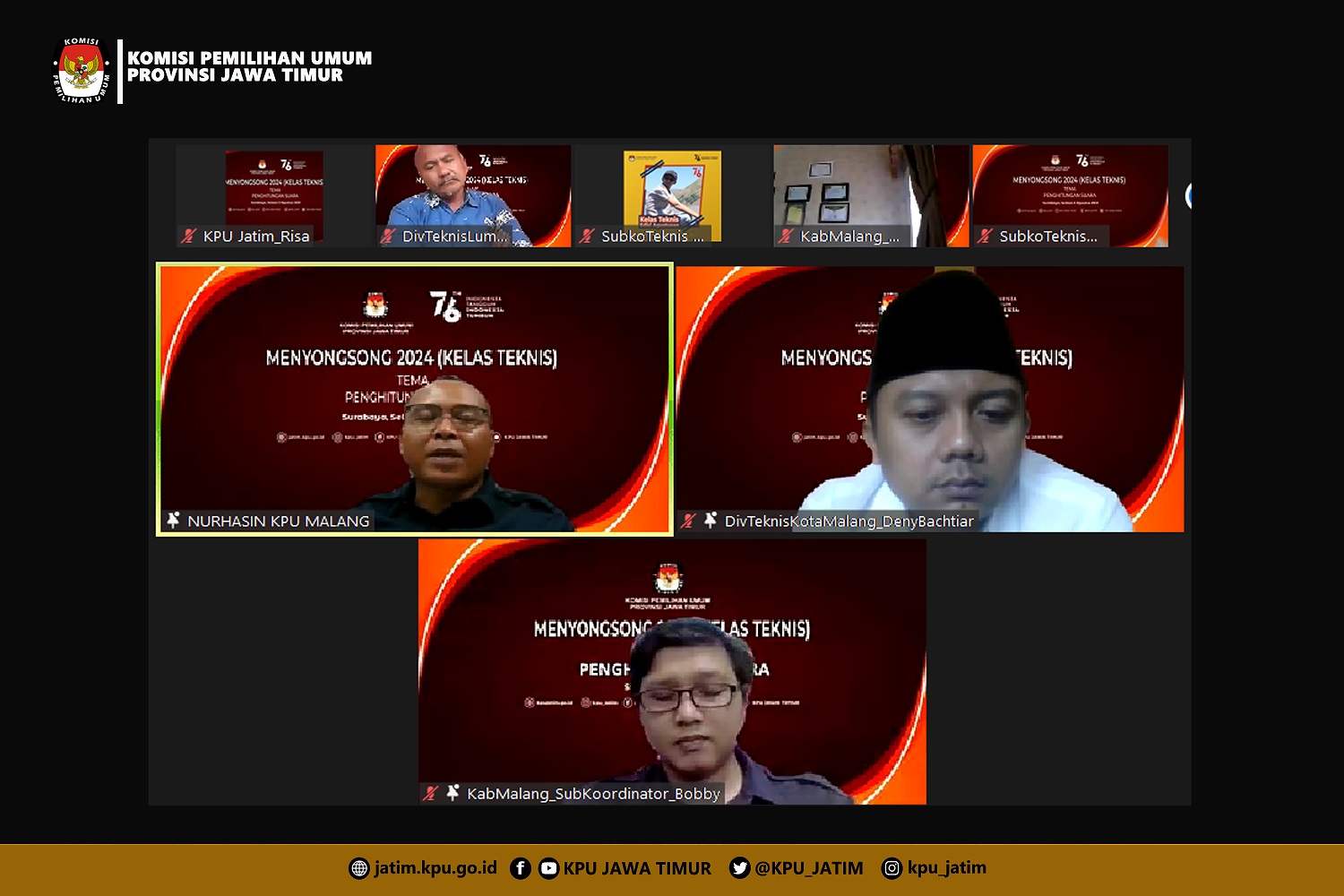 Surabaya, jatim.kpu.go.id- Rekapitulasi Penghitungan Suara menjadi tema dalam bahasan Kelas Teknis Menyongsong 2024 ke-6 (Kamis, 5/8). Tema ini selanjutnya oleh KPU Jatim dan penyelenggara di Jawa Timur dibedah dari dua sudut pandang, yakni pertama, Perjalanan Rekapitulasi Hasil Penghitungan Perolehan Suara Pemilihan 2020 dan Liku-liku dimasa Pandemi. Serta kedua, Proses Rekapitulasi Hasil Penghitungan Perolehan Suara Tingkat Kabupaten/ Kota. Divisi Teknis Penyelenggaraan KPU Kota Blitar, Hernawan M. Khabib dalam paparannya yang berjudul Perjalanan Rekapitulasi Hasil Penghitungan Perolehan Suara Pemilihan 2020 dan Liku-liku dimasa pandemi, selain menyampaikan alur rekapitulasi juga berbagi pengalaman mengenai proses rekapitulasi hasil penghitungan perolehan suara Pemilihan 2020 yang dilaksanakan dimasa pandemi Covid-19. “Pelaksanaan Pemilihan 2020 harus menaati dan menyesuaikan dengan protokol kesehatan pencegahan dan pengendalian Covid-19 dengan memperhatikan kesehatan dan keselamatan penyelenggara, peserta, pemilih dan seluruh pihak yang terlibat dalam penyelenggaraan. Maka dalam pelaksanaan rekapitulasi menerapkan beberapa hal, diantaranya a) penggunaan APD berupa masker, b) penyediaan sarana sanitasi yang memadai, c) pengecekan suhu tubuh, d) pengaturan menjaga jarak paling kurang 1 meter, dan lain sebagainya,” papar Khabib. Sementara itu, penyaji berikutnya, Divisi Teknis Penyelenggaraan KPU Kabupaten Pacitan, Agus Susanto menjelaskan lebih detail terkait proses rekapitulasi hasil penghitungan perolehan suara tingkat kabupaten/ kota. Mulai dari tahapan persiapan rekapitulasi, berbagai formulir rekapitulasi tingkat kabupaten/ kota, tahapan pelaksanaan rekapitulasi, serta tahapan penyelesaian keberatan. Usai paparan disampaikan, dilanjutkan dengan sesi diskusi dan ulasan dari Divisi Teknis Penyelenggaraan KPU Jatim, Insan Qoriawan. Insan mengungkapkan jika penghitungan suara ialah tahapan puncak dari pemilu, maka rekapitulasi penghitungan perolehan suara salah satu tahapan yang sangat krusial. “Rekapitulasi penghitungan perolehan suara menjadi tahapan krusial karena pada tahapan ini dikumpulkan hasil penghitungan suara dari TPS-TPS,” ungkapnya. Lalu untuk rekapitulasi di tingkat kabupaten/ kota, Insan menuturkan bahwa rekapitulasi di tingkat kabupaten/ kota akan menghasilkan sebuah produk hukum yang berupa surat keputusan atau biasa disebut dengan SK. SK ini nantinya akan menjadi objek sengketa di MK. Maka segala keberatan untuk pemilu di tingkat kabupaten/ kota diselesaikan di tingkat kabupaten/ kota, karena di kabupaten/ kota ini akan keluar produk hukum. Untuk SK ini harus detail, tanggal sudah harus pasti dan bahkan ditulis jamnya,” tegas Divisi Teknis Penyelenggaraan KPU Jatim menutup ulasannya. (AACS)