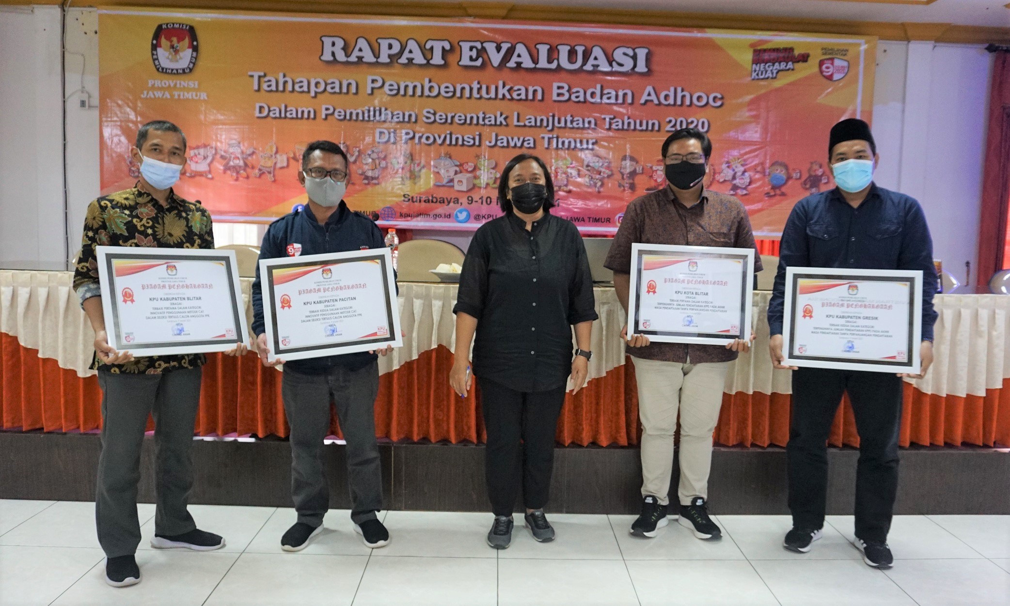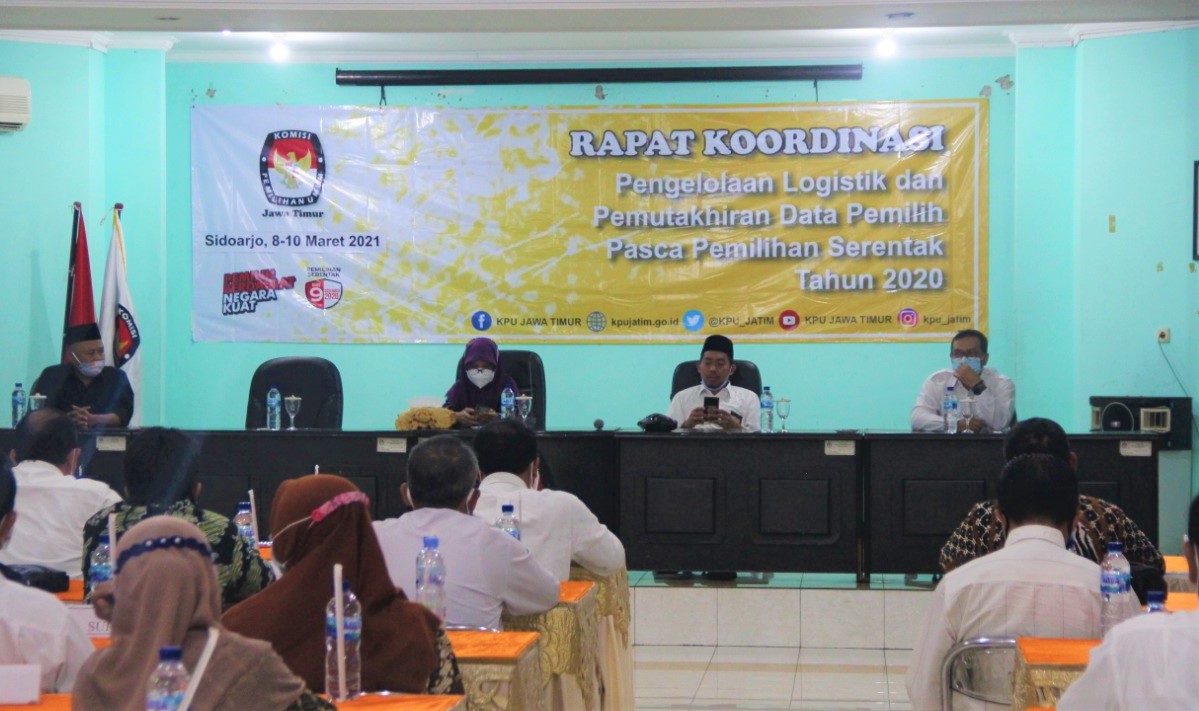 Surabaya, jatim.kpu.go.id- Komisi Pemilihan Umum Provinsi Jawa Timur (KPU Jatim) bersama dengan 19 KPU Kabupaten/ Kota melakukan evaluasi tahapan pembentukan badan Ad Hoc pada penyelenggaraan Pemilihan Serentak Tahun 2020 hari ini sampai dengan besok (Selasa-Rabu, 9-10/3). Rapat evaluasi dilaksanakan di aula lantai II kantor KPU Jatim, jalan Raya Tenggilis Nomor 1-3 Surabaya. Divisi SDM dan Litbang KPU Jatim, Rochani dalam sambutannya mewakili Ketua KPU Jatim yang berhalangan hadir karena agenda lain, mengungkapkan pentingnya diadakan rapat evaluasi. “Kegiatan evaluasi ini salah satu rangkaian kewajiban yang harus Kita tuntaskan sebagai akhir dari kegiatan pemilihan. Lalu apa pentingnya dilakukan evaluasi? Pentingnya dilakukan evaluasi ini untuk mengukur seberapa besar KPU sudah mampu menjalan program dengan baik,” ujar mantan Ketua KPU Kota Batu ini (9/3/2021). Melanjutkan yang telah disampaikan, Rochani berharap evaluasi ini manfaatnya tidak hanya untuk kelembagaan tapi juga untuk evaluasi secara personal, sehingga dapat untuk perbaikan program maupun kebijakan kedepan. Lebih lanjut, sebelum mengakhiri sambutannya, Rochani memberikan apresiasi kepada 19 KPU Kabupaten/ Kota yang telah mampu melaksanakan tahapan pembentukan badan Ad Hoc dengan sangat baik. “Indikator pelaksanaan pembentukan badan Ad Hoc dapat dilaksanakan dengan baik, salah satunya sampai dengan hari ini belum ada aduan atau laporan kode etik yang berkaitan dengan pembentukan badan Ad Hoc,” tuturnya. Rapat evaluasi melibatkan Divisi Sosdiklih; Parmas dan SDM, Kasubbag Umum dan Logistik, serta operator Byname Badan Ad Hoc dari 19 KPU Kabupaten/ Kota di Jawa Timur. Usai pembukaan, acara dilanjutkan dengan pengarahan umum, pengantar evaluasi tahapan pembentukan badan Ad Hoc, dan paparan kabupaten/ kota. (AACS)