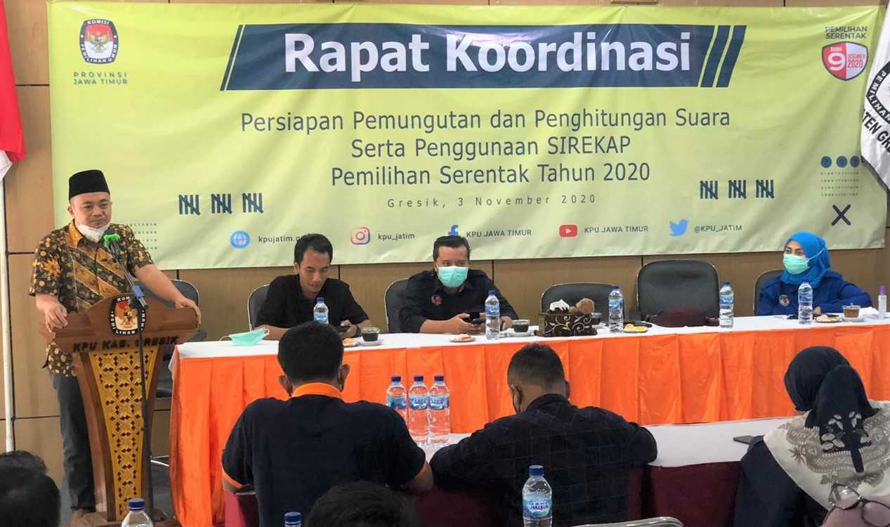 Gresik, jatim.kpu.go.id- Detik-detik menjelang puncak Pemilihan Serentak Tahun 2020, tanggal 9 Desember, Komisi Pemilihan Umum Provinsi Jawa Timur (KPU Jatim) kembali melakukan koordinasi bersama 19 KPU Kabupaten/ Kota mengenai tahapan Pemungutan, Penghitungan (Pungut Hitung) dan Rekapitulasi Suara. Rapat Koordinasi Persiapan Pemungutan dan Penghitungan Suara serta Penggunaan SIREKAP Pemilihan Serentak Tahun 2020 dilaksanakan selama satu hari, Selasa (3/11) di kantor KPU Kabupaten Gresik, jalan Dr. Wahidin Sudiro husodo Nomor 690 Gresik. Nampak hadir dari KPU Jatim, Divisi Teknis Penyelenggaraan, Insan Qoriawan, Divisi Hukum dan Pengawasan, Muhammad Arbayanto, serta staf subbag Teknis dan Hupmas. Peserta terdiri dari Divisi Teknis Penyelenggaraan 19 KPU Kabupaten/ Kota di Jawa Timur. Divisi Hukum dan Pengawasan, Muhammad Arbayanto menyampaikan bahwa rakor ini penting diselenggarakan mengingat saat ini sudah di detik-detik menuju puncak Pemilihan Serentak 2020. “Pertama, nanti di 9 Desember ada banyak hal baru yang akan dihadapi, terutama dalam tahapan Pemungutan, Penghitungan dan Rekapitulasi Suara. Karena publik yang dilibatkan tidak dalam jumlah yang terbatas seperti tahapan-tahapan sebelumnya, namun melibatkan seluruh pemilih sehingga dibutuhkan tertib dan disiplin protokol kesehatan yang ketat,” jelas Arba dalam sambutannya mewakil Ketua KPU Jatim yang berhalangan hadir (3/11/2020). Arba melanjutkan, “Kedua, Kita akan menghadapi tahapan rekapitulasi dengan menggunakan SIREKAP. Ini pengalaman pertama bagi Kita. Tahapan penghitungannya masih manual, namun produk administrasinya terintegrasi dalam SIREKAP. Jadi atau tidaknya penggunaan SIREKAP akan ditentukan oleh dua hal, yakni hasil simulasi dan pemetaan Provinsi dan Kabupaten/ Kota apakah menunjukkan indikasi yang positif. Lalu kedua, konsultasi RDP di Komisi II DPR RI, apakah mengizinkan KPU menggunakan SIREKAP, ataukah digunakan untuk sebagian wilayah saja, atau digunakan di seluruh Indonesia, atau tidak sama sekali digunakan”. Divisi Hukum dan Pengawasan KPU Jatim ini juga meminta kepada KPU Kabupaten/ Kota untuk memetakan permasalahan ketika melakukan simulasi Pemungutan; Penghitungan dan penggunaan SIREKAP, dan menyampaikannya kepada KPU RI. “Harapan Saya KPU Kabupaten/ Kota bisa memetakan, memformulasikan dan menyampaikan potensi-potensi permasalahan saat melakukan simulasi. Karena hasil dari simulasi ini akan menentukan pula apakah SIREKAP akan diimplementasikan di Pemilihan Serentak 2020 ini,” tutup Arba. (AACS)
