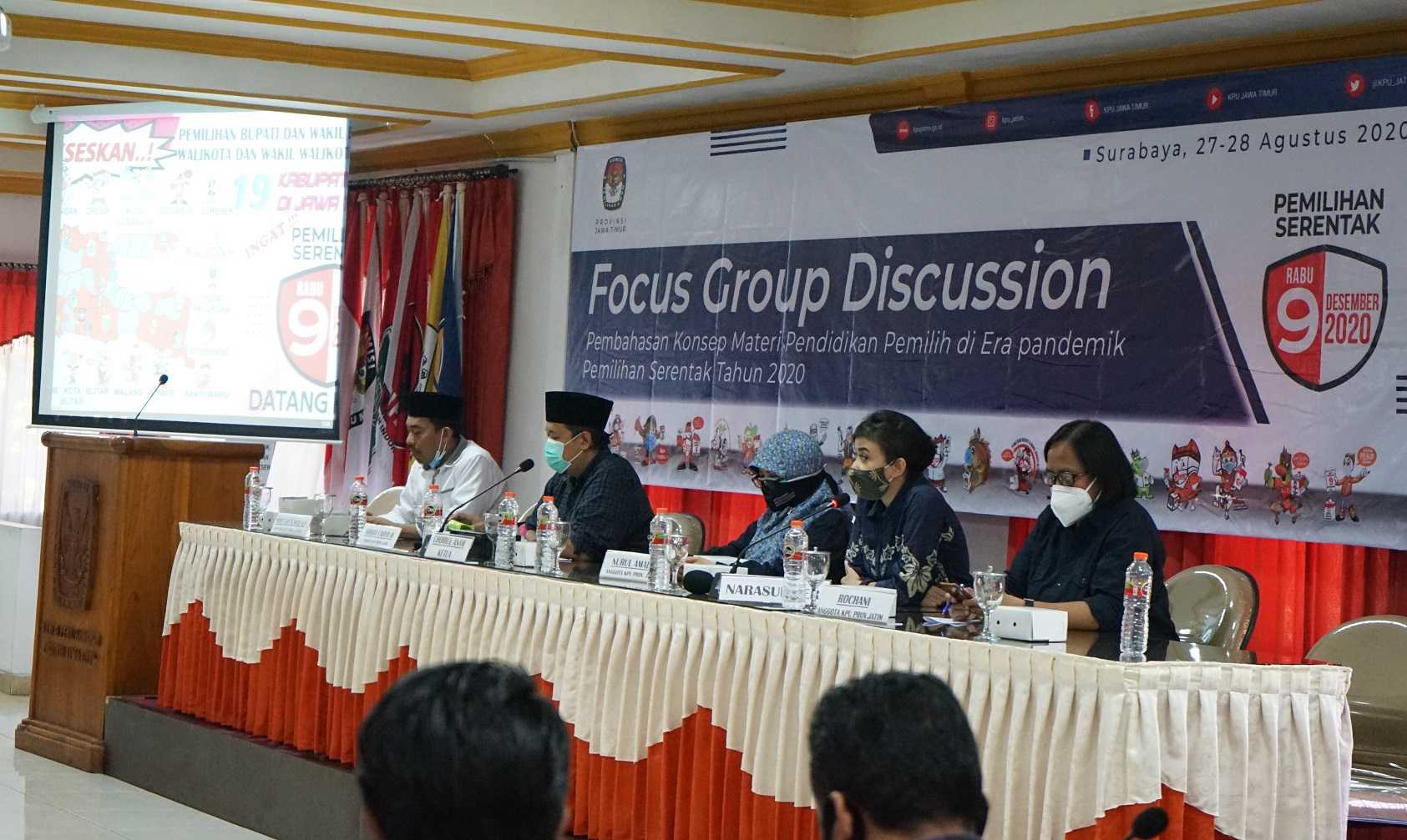 Surabaya, jatim.kpu.go.id- Komisi Pemilihan Umum Provinsi Jawa Timur (KPU Jatim) mengadakan Focus Group Discussion/ Diskusi Kelompok Terarah hari ini (Kamis, 27/8). Focus Group Discusson (FGD) dilakukan guna menghimpun masukan dari berbagai unsur mengenai materi pendidikan pemilih di era pandemi.