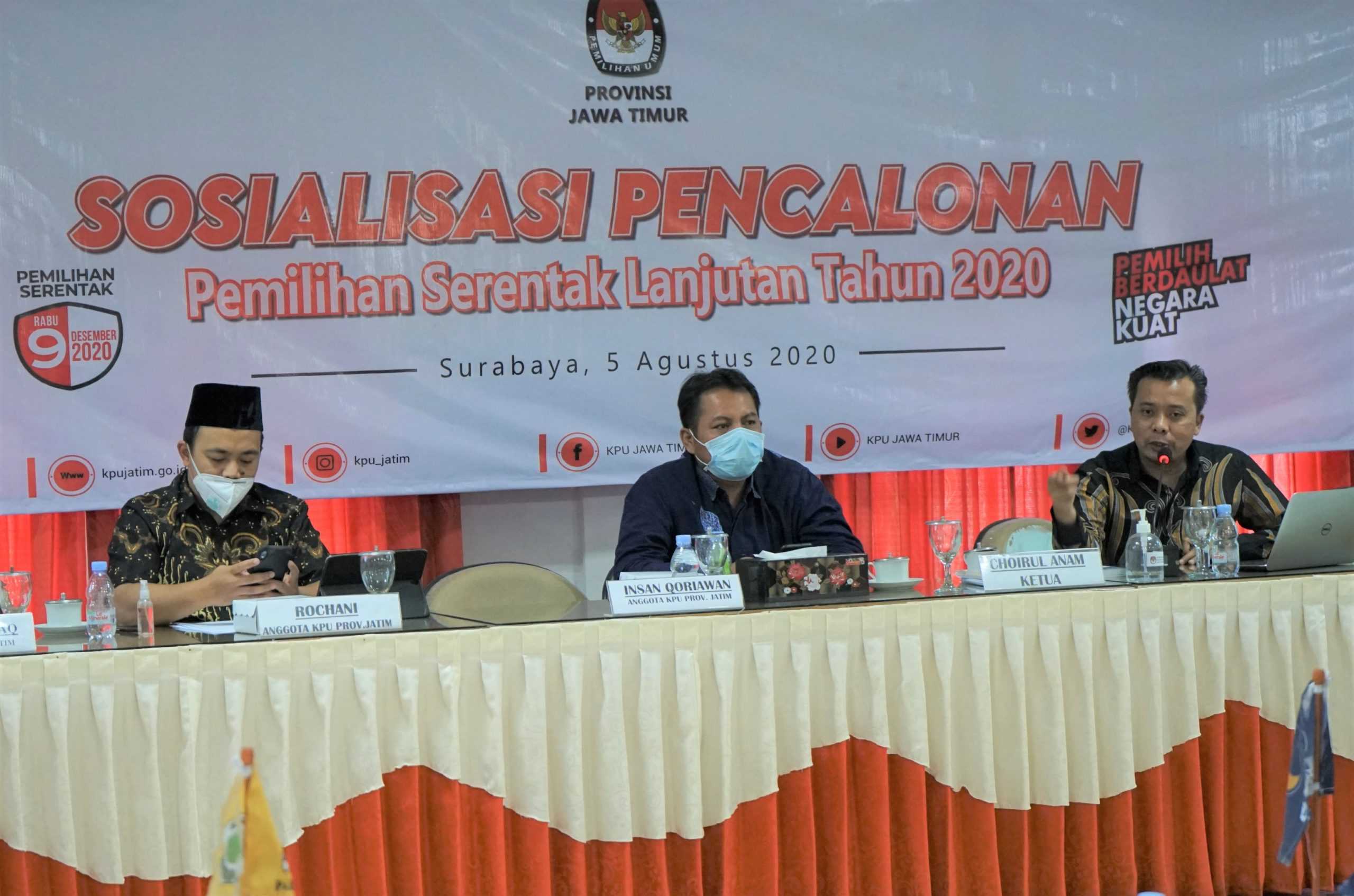Surabaya, jatim.kpu.go.id- Tahapan Pencalonan Pemilihan Serentak Lanjutan Tahun 2020 sudah di depan mata. Tahapan ini merupakan fase yang sangat krusial. Tegas Anggota Komisi Pemilihan Umum Provinsi Jawa Timur (KPU Jatim), Gogot Cahyo Baskoro di hadapan peserta Bimbingan Teknis (Bimtek) Pencalonan Pemilihan Serentak Lanjutan Tahun 2020 hari ini (Kamis, 13/8). Bimtek dijadwalkan digelar selama dua hari, Kamis sampai Jum’at (13-14/8) di aula lantai II kantor KPU Jatim, jalan Raya Tenggilis Nomor 1-3 Surabaya. Peserta terdiri dari Ketua, Divisi Teknis Penyelenggaraan, Kasubbag Teknis dan Hupmas dari 19 KPU Kabupaten/ Kota di Jawa Timur. Sebelumnya, Ketua Panitia Kegiatan, Yulyani Dewi menerangkan bahwa Bimtek dilaksanakan guna menyamakan persepsi serta pemantapan pemahaman terkait PKPU Pencalonan Pemilihan Serentak Lanjutan Tahun 2020. “Ditargetkan setelah mengikuti Bimtek ini, 95% peserta dapat menyerap materi dan memahami tahapan serta proses Pencalonan dengan baik. Sehingga dapat terwujud suksesnya Pemilihan Serentak 2020 dan melahirkan Kepala Daerah yang legitimate,” terang Dewi (13/8/2020). Berikutnya, Divisi Sosdiklih dan Parmas KPU Jatim, Gogot Cahyo Baskoro dalam sambutannya mewakili Ketua KPU Jatim menegaskan jika dalam waktu dekat akan memasuki tahapan Pencalonan, dimana ini merupaka fase yang sangat krusial. “Pada tahapan Pencalonan Kawan-kawan hati-hati, cermat dan teliti. Karena pada tahapan ini rentan dengan gangguan. Dimasa Pencalonan Kita akan banyak bersinggungan dengan pihak-pihak eksternal, dan sangat memungkin akan banyak gangguan yang mencoba mempengaruhi kebijakan KPU. Belum lagi munculnya persoalan dualisme kepengurusan parpol, rekomendasi ganda dari parpol itu sangat mungkin. Makanya Kita minta ekstra hati-hati, terus pegang teguh aturan, jangan mencari celah dan posisikan diri Kawan-kawan sebagai keluarga besar KPU,” jelas Gogot. Tak cukup sampai di situ, pada tahapan Pencalonan ini juga rawan gugatan. “Kami berharap KPU Kabupaten/ Kota tidak perlu bermain-main dalam tahapan Pencalonan dan bekerja sesuai dengan peraturan yang ada. Kalau memungkinkan simulasikan kemungkinan-kemungkinan persoalan apa saja yang akan muncul dalam proses Pencalonan ini. Serta carikan solusinya,” ujar mantan Anggota KPU Kabupaten Jember ini. Usai pembukaan, acara dilanjutkan dengan arahan Deputi Bidang Dukungan Teknis KPU RI, Muhammad Eberta Kawima dan Anggota KPU Jatim, lalu pemaparan materi Pencalonan Pemilihan Serentak Lanjutan Tahun 2020 oleh Divisi Teknis Penyelenggaraan KPU Jatim, Insan Qoriawan, serta sesi diskusi. Sementara esok hari, Kamis (14/8), peserta akan mendapatkan materi terkait Standar Pemeriksaan Kesehatan Calon Kepala Daerah. (AACS)