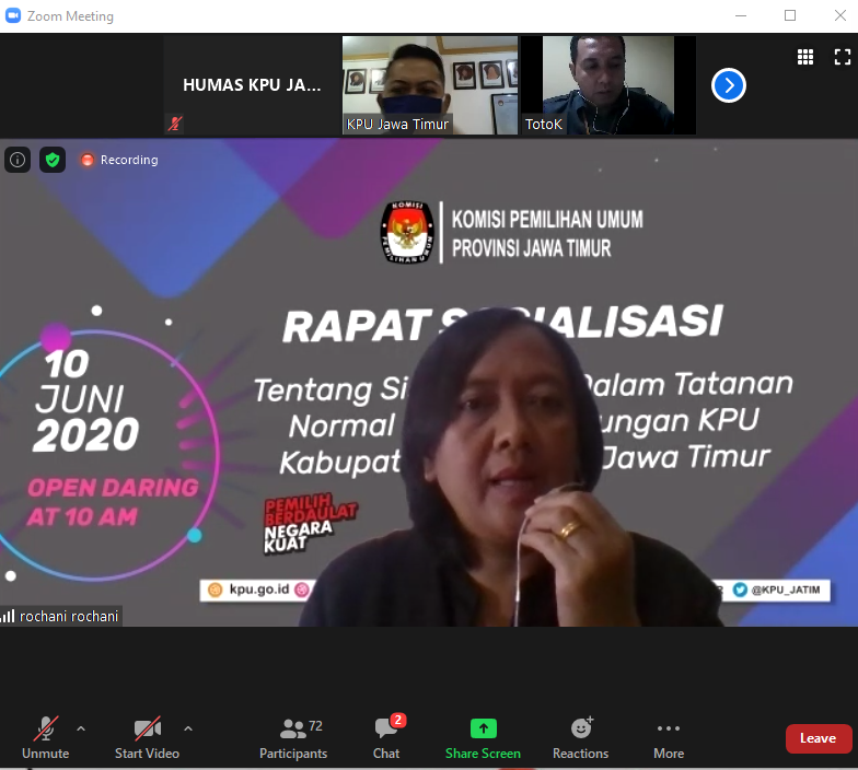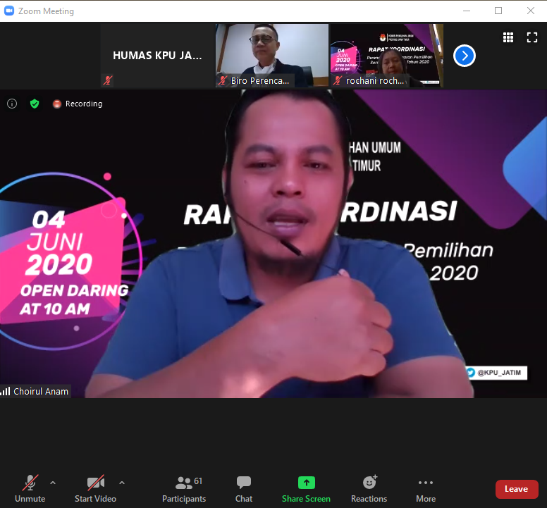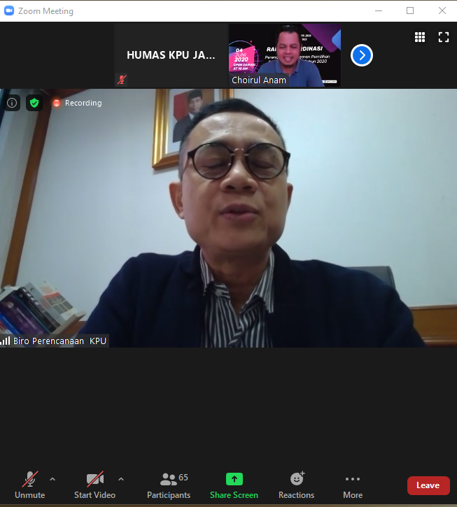 Surabaya, jatim.kpu.go.id- Menyikapi tahapan Pemilihan Serentak 2020 Lanjutan akan segera dimulai, Komisi Pemilihan Umum Jawa Timur (KPU Jatim) terus mematangkan persiapannya. Hari ini (Kamis, 11/6) jam 10 pagi, persiapan dan perencanaan pengadaan logistik Pemilihan Serentak Tahun 2020 dikoordinasikan bersama 19 KPU Kabupaten/ Kota di Jawa Timur melalui rapat virtual. Rapat dihadiri oleh Divisi Perencanaan dan Logistik KPU Jatim, Miftahur Rozaq, Divisi SDM dan Litbang, Rochani, Plt. Sekretaris, Suharto, Kabag Keuangan; Umum dan Logistik, Edi Hartono, serta staf Subbag Umum dan Logistik KPU Jatim. Berikutnya, Rakor Persiapan dan Perencanaan Pengadaan Logistik Pemilihan Serentak Tahun 2020 ini diikuti oleh Ketua, Sekretaris, PPKom, serta Kasubbag Umum dan Logistik 19 KPU Kabupaten/ Kota. Istimewanya hadir sebagai narasumber, langsung dari Biro Logistik KPU RI, Ibrahim Nur dan Pandu Dwiatma. Anggota KPU Jatim, Rochani dalam sambutannya mewakili Ketua KPU Jatim, menyampaikan penyelenggaraan Pemilihan 2020 di masa pandemi ini membawa konsekuensi pada penyelenggaraan pemilihan dengan protokol Kesehatan, dan ini berpengaruh terhadap kebutuhan logistik. “Sehingga rapat koordinasi ini menjadi penting untuk memberikan gambaran kepada Kita mengenai kebutuhan apa saja yang dibutuhkan di era tatanan baru ini. Selanjutnya tentu disamping identifikasi kebutuhan, mekanisme pengadaannya juga patut menjadi perhatian bersama. Apalagi dalam kondisi penyelenggarakan pemilihan yang sangat dikejar oleh waktu dan sudah sangat berhimpitan tahapannya,” ungkapnya (11/06/2020). Mengimbuhkan yang disampaikan Rochani, Divisi Perencanaan dan Logistik KPU Jatim, Miftahur Rozaq menjelaskan bahwa tahapan pengadaan akan dimulai 2,5 bulan lagi. “Di bulan Agustus Kita sudah mulai ada pengadaan terkait logistik Pemilihan, dan penting dimaksimalkan di forum ini untuk membahas mengenai persiapan pengadaan, permasalahan dan langkah-langkah yang perlu diambil. Kita juga akan mendapatkan pencerahan dan sharing informasi dari Biro Logistik KPU RI mengenai hal tersebut,” terangnya. Usai pemaparan materi dari Biro Logistik KPU RI, selanjutnya diisi dengan diskusi. Acara ini pun berlangsung sekitar 3 jam, dan ditutup sekitar pukul 13.00 WIB. (AACS/AR)