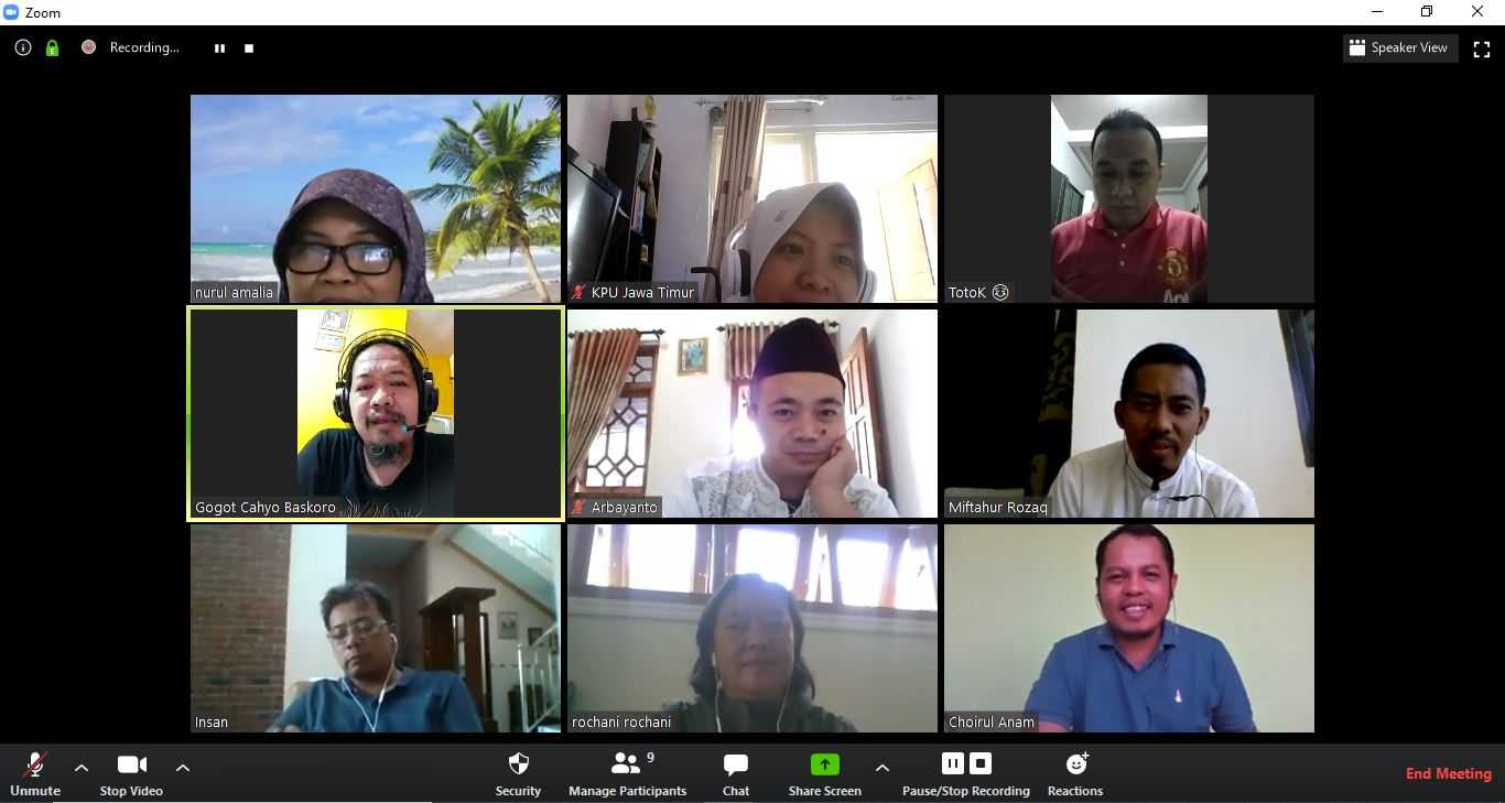 Khotmil Qur’an Online KPU se-Provinsi Jawa Timur kali ini (Kamis, 21/5) dimulai sekitar jam tiga sore sampai dengan kurang lebih jam lima sore. Diawali dengan Pembukaan oleh Ketua KPU Jatim, sambutan sekaligus tausiyah Ketua KPU RI, Khotmil Qur’an yang dipimpin oleh Miftahur Rozaq (Anggota KPU Jatim), do’a oleh Fahim Amrillah (Anggota KPU Kabupaten Madiun), dan Penutup.