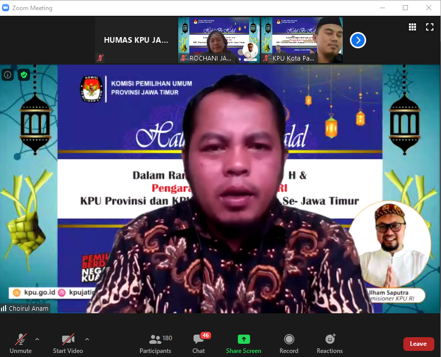Surabaya, jatim.kpu.go.id- Berkesempatan menyampaikan tausiyah pada kegiatan Khotmil Qur’an Online KPU se-Provinsi Jawa Timur “Do’a untuk Keselamatan Bangsa dan Sukses Pemilihan Serentak 2020” (Kamis, 21/5), Ketua KPU RI, Arief Budiman mengajak seluruh peserta kegiatan untuk melakukan tiga hal. Yakni, untuk selalu bersyukur, menjalin silaturahmi, serta memberikan manfaat bagi generasi mendatang.
