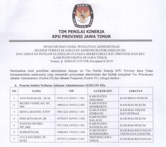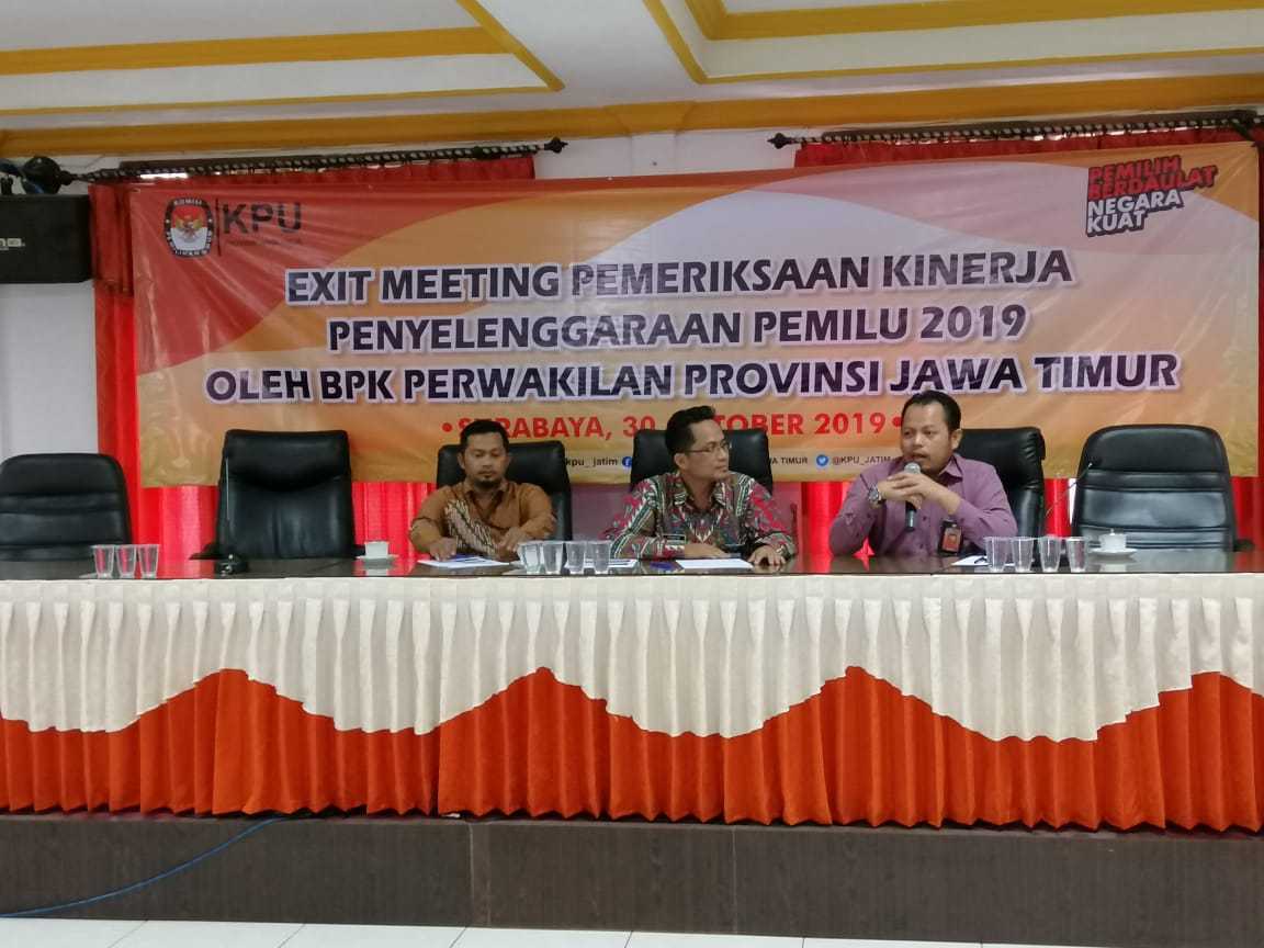 Surabaya, jatim.kpu.go.id- Usai pelaksanaan audit kinerja selama 30 hari (selama bulan Oktober-red) oleh Badan Pemeriksa Keuangan (BPK) Perwakilan Provinsi Jawa Timur, Komisi Pemilihan Umum Jawa Timur (KPU Jatim) menggelar Exit Meeting. Kegiatan ini berlangsung di aula lantai II kantor KPU Jatim dari jam 2 siang sampai dengan selesai, dengan dihadiri oleh Tim Pemeriksa dari BPK Perwakilan Provinsi Jawa Timur dan Ketua dan Sekretaris KPU Kabupaten/Kota yang menjadi subjek sampling BPK. Ketua Tim Audit BPK Perwakilan Provinsi Jawa Timur, Sulistia Purnama menjelaskan terkait prosedur pemeriksaan audit yang telah dilakukan sebelumnya sekaligus terkait dengan hasil audit tersebut. “Hasil audit nantinya akan diberikan ke masing-masing satuan kerja untuk kemudian ditanggapi sesuai dengan batas waktu yang ditentukan. Selanjutnya hasil pemeriksaan kinerja ini akan dilaporkan dan bermuara di DPR, agar bisa digunakan sebagai bahan pertimbangan dalam penyusunan Undang-undang terkait penyelenggaraan pemilu untuk pemilu selanjutnya,” terangnya (30/10/2019). Berikutnya, Ketua KPU Jatim, Choirul Anam dalam sambutannya menyampaikan terima kasih atas bahwa audit kinerja yang dilakukan oleh BPK di satuan kerja KPU selama 30 hari ini. “Kami KPU di Jawa Timur mengucapkan terima kasih atas audit kinerja yang dilakukan oleh BPK Perwakilan. Audit ini Kami maknai sebagai wadah pembinaan kinerja bagi satuan kerja Kami agar menjadi lebih baik lagi. Dengan audit kinerja ini, harapannya KPU menjadi lembaga yang lebih baik dan bekerja lebih profesional lagi dalam penyelenggaraan pemilu yang akan datang,” ucap Ketua KPU Jatim. Ketua KPU Jatim melanjutkan, “Mengenai tanggapan hasil audit kinerja oleh BPK, KPU di wilayahnya akan menyiapkan dengan baik jawaban maupun dokumen pendukung untuk menanggapi apa saja yang ditemukan oleh BPK. Jika temuan tersebut terkait dengan kekurangan/ ketidaklengkapan dokumen maka KPU Provinsi dan KPU Kabupaten/ Kota di wilayah Provinsi Jawa Timur akan bersedia melengkapinya”. Terakhir, Ketua KPU Jatim ini menyampaikan terimakasih kembali atas audit kinerja yang dilakukan oleh BPK Perwakilan Provinsi Jawa Timur ini. (ProgDa/AACS)